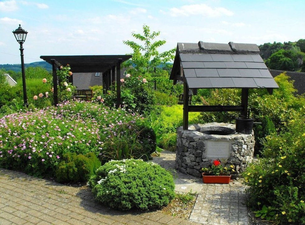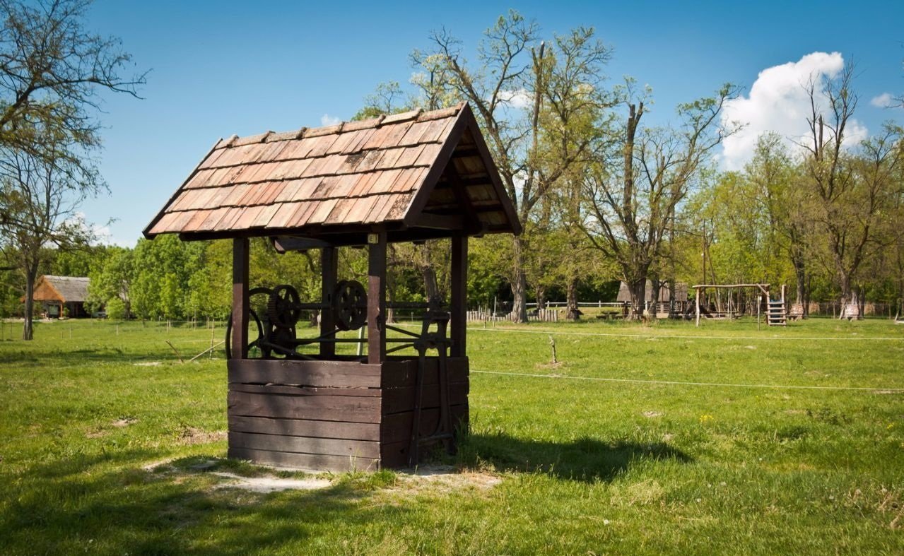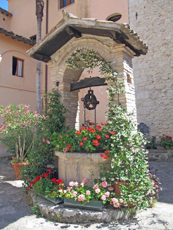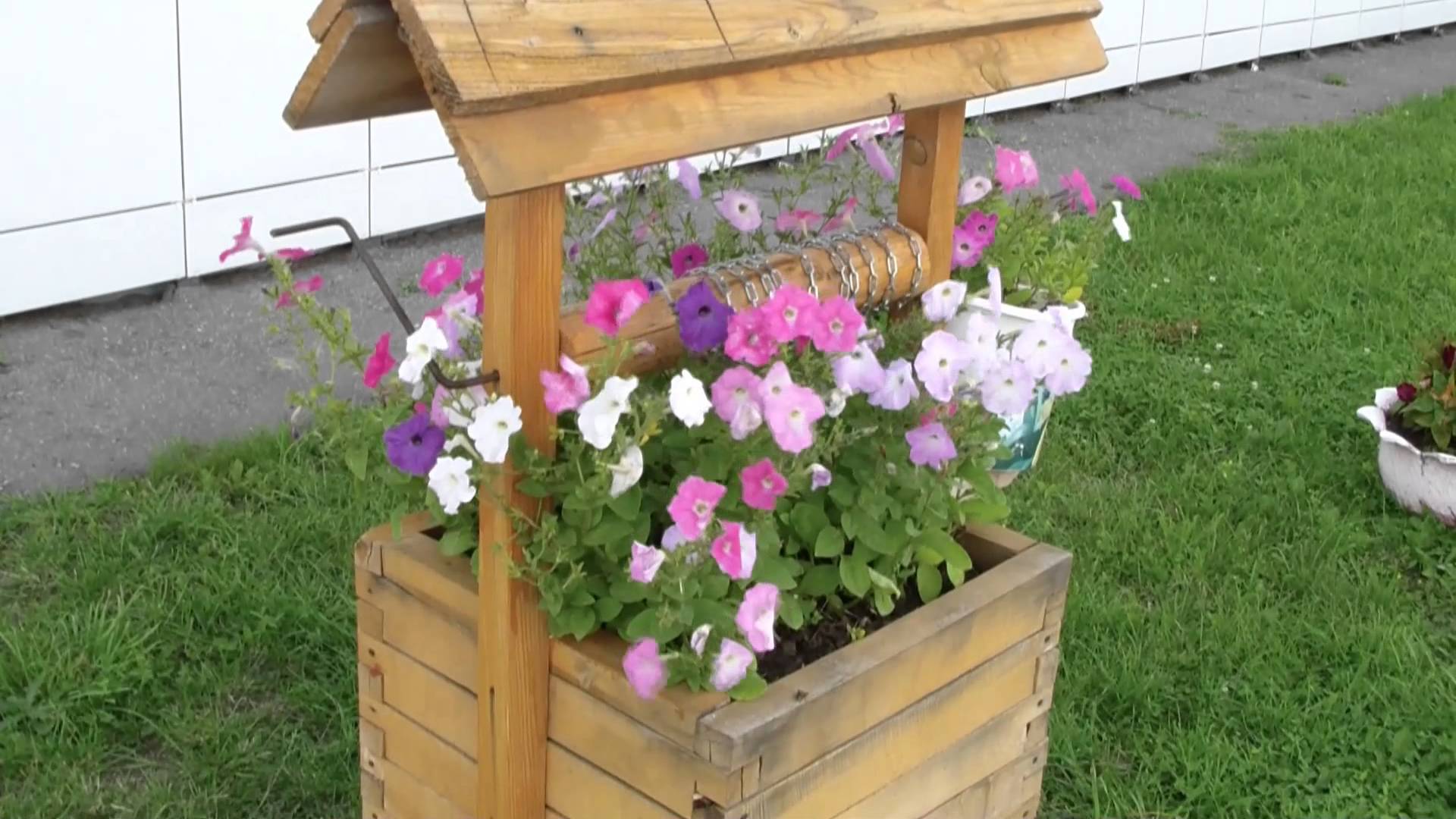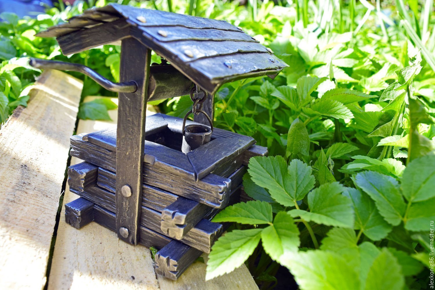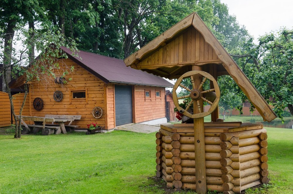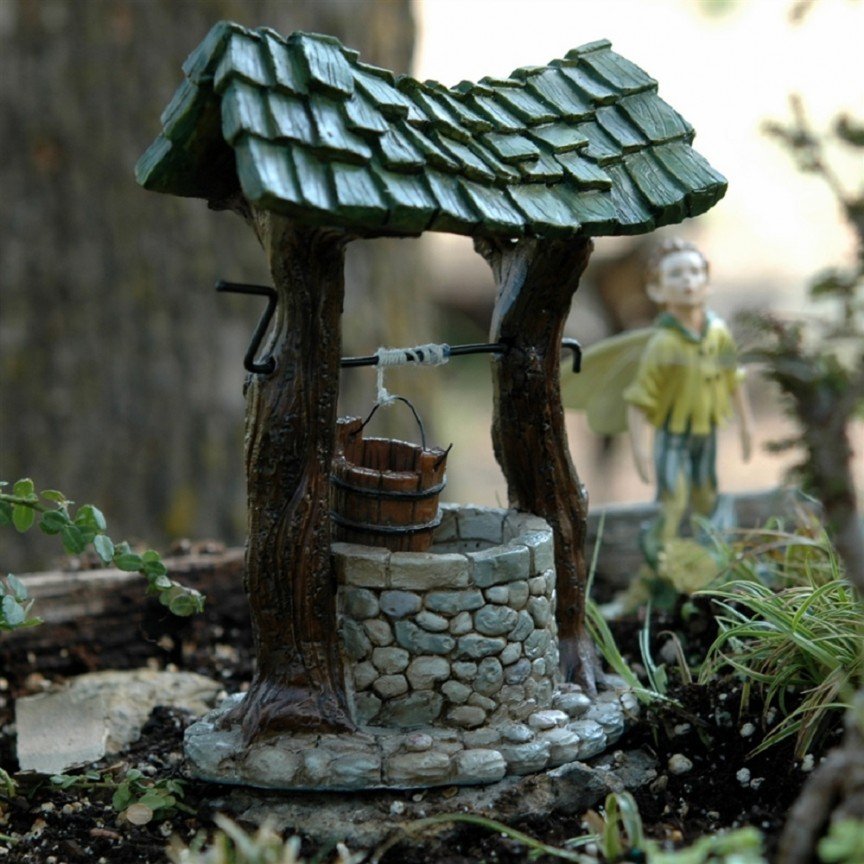 El espacio alrededor del pozo está hecho de losas, guijarros, decorados con plantas en macetas, esculturas de yeso, "gnomos de jardín" tallados.