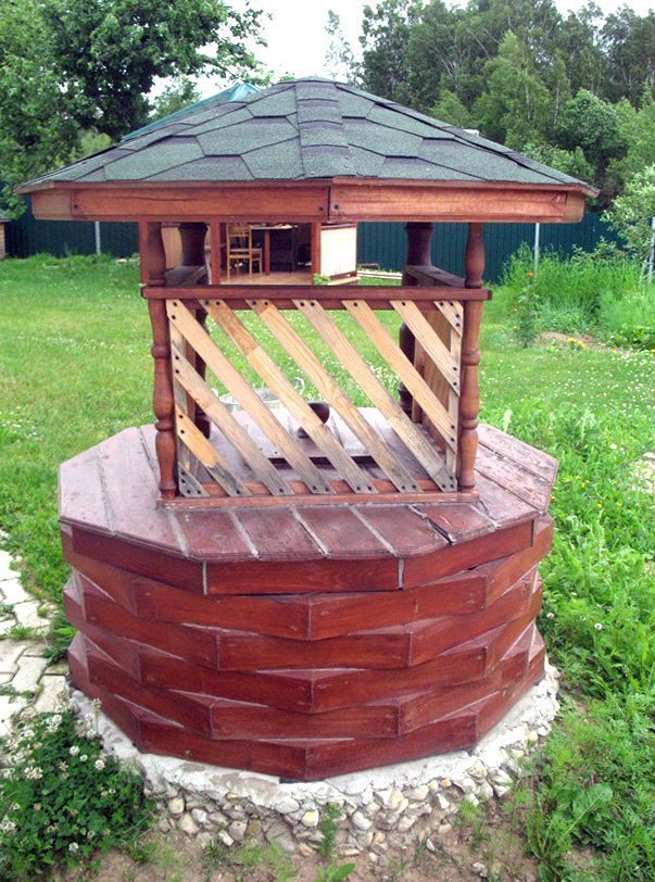 Existen tipos de pozos muy simples que incluso un niño puede hacer. Pero consideraremos la fabricación paso a paso con nuestras propias manos de un pozo decorativo de madera con seis esquinas. Tal como en la imagen de abajo.
