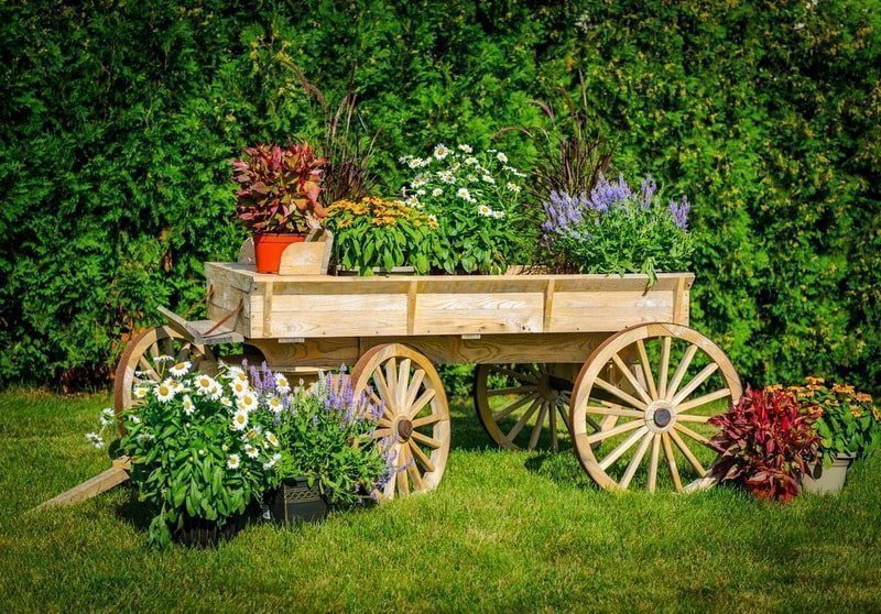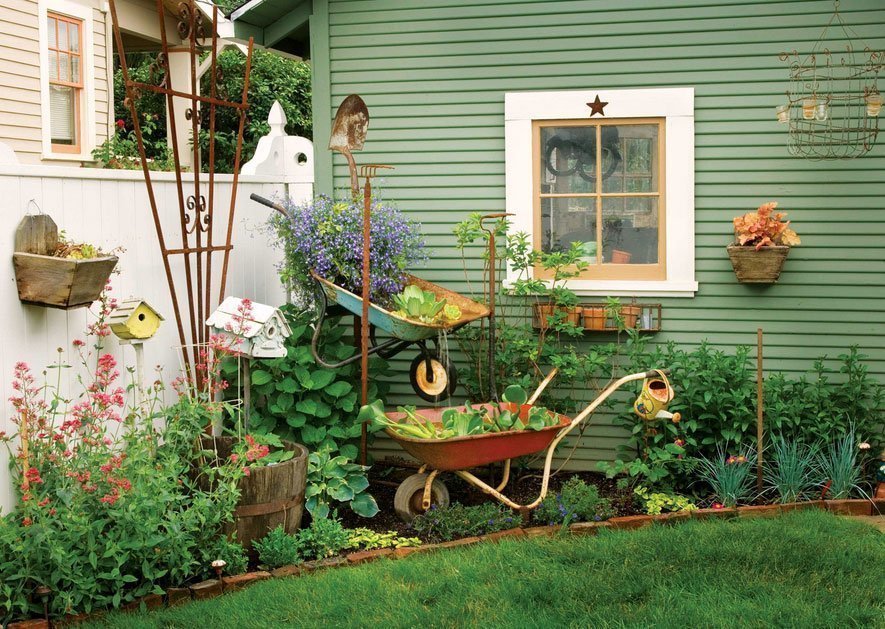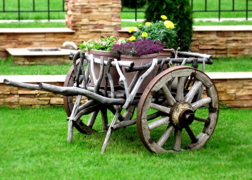 El jardín del pueblo es el reino de los accesorios. Cupidos, gnomos y fuentes decorativas no son necesarios aquí. Las herramientas y accesorios agrícolas son adecuados para la decoración. Con la decoración estadounidense, lo principal es no exagerar.De lo contrario, todo se verá falso, sobrecargado de detalles. En la entrada de la casa, coloque un banco brillante. Alrededor de la terraza empedrada, plantar uvas de niña. Desde las cubiertas, haga un pozo decorativo. En el carrito puedes plantar flores. Si pones una vieja escalera de mano en un árbol y dejas que los escaladores crezcan en ella, también se convertirá en un elemento de decoración.