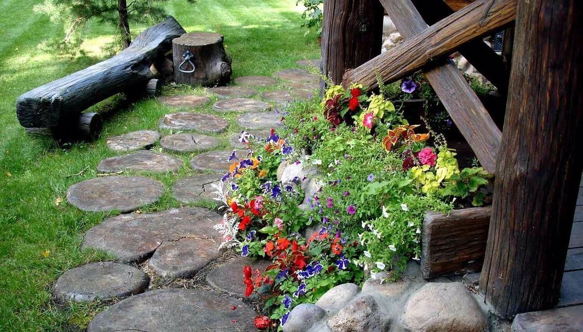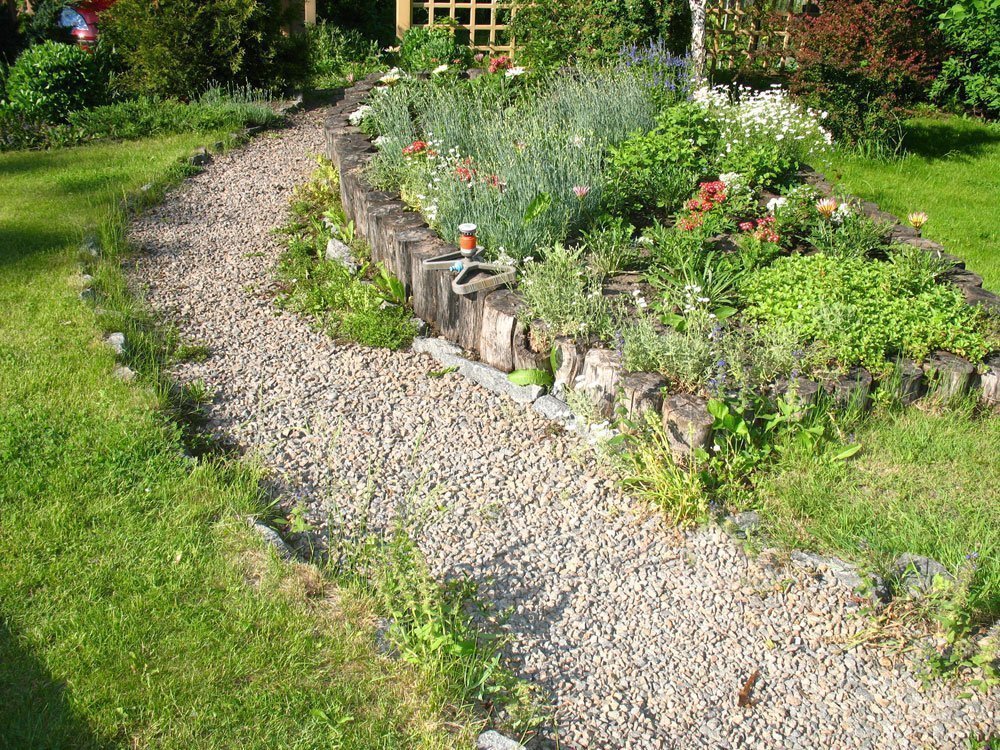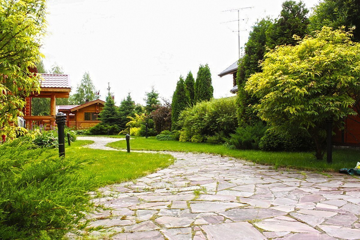 Los caminos están hechos de materiales naturales: madera, arena, cribados de granito, grava. Nunca están parejos, pavimentando, descuidados. Mirándolos, debería parecer que tienen unos 100 años. Si coloca el azulejo, entonces debe ser con chips, a través del cual brotaron los dientes de león. A lo largo de las pistas: un borde animado de una mezcla de colores brillantes. También se pueden colocar cubos de madera o regaderas con hierba brotada de agua o plantas perennes. Para los niños, tocar en esas pistas será un verdadero viaje a un cuento de hadas.