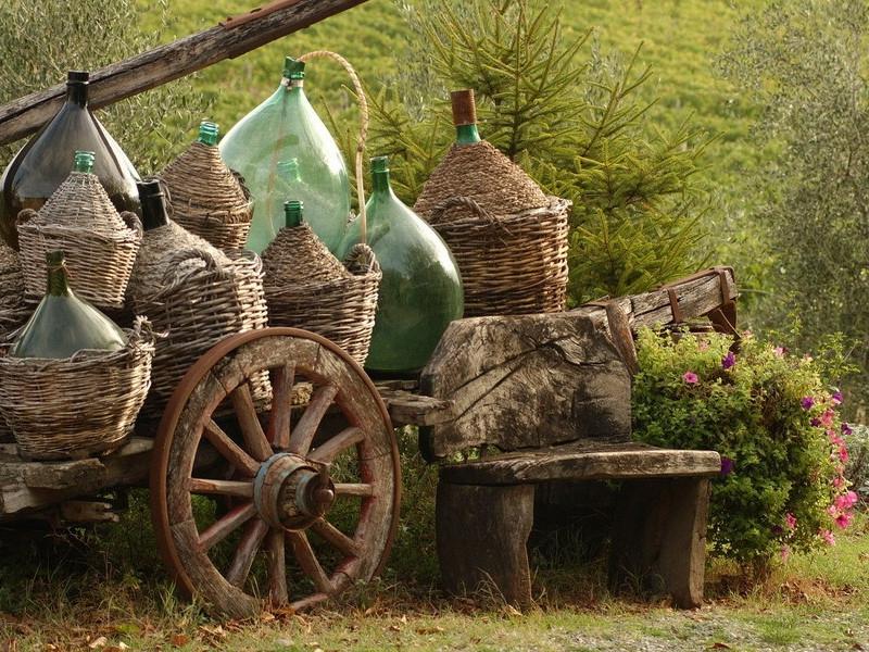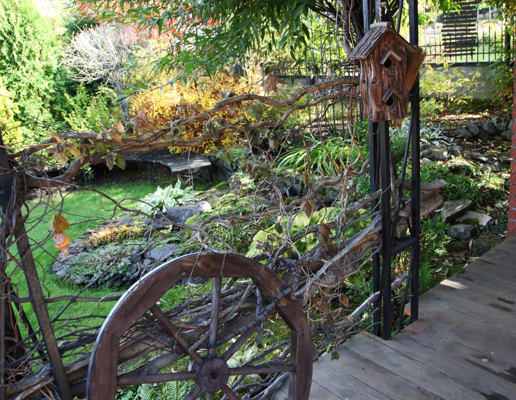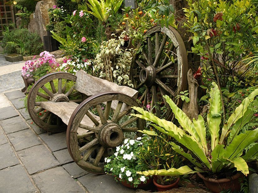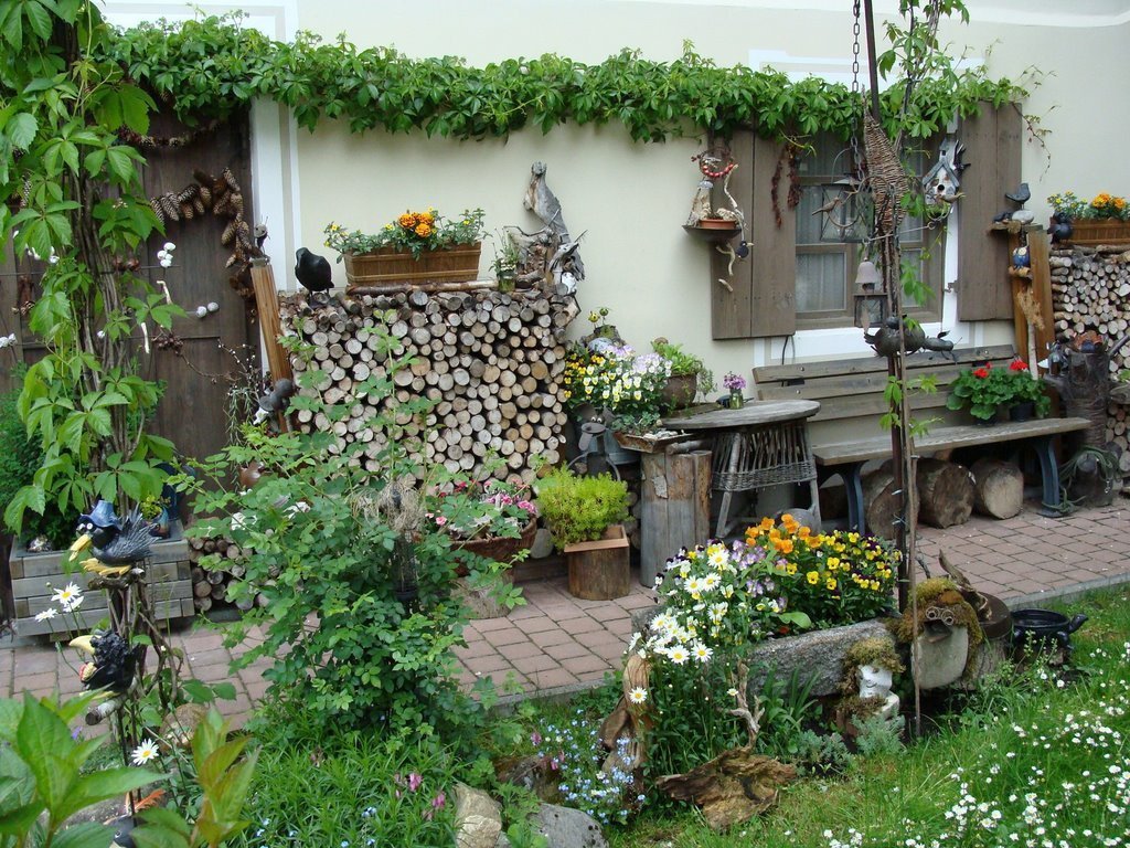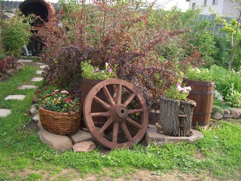 Como elementos de diseño, use barriles viejos, cubos, regaderas galvanizadas. Los muebles están hechos a mano o ordenados por artesanos. También puede utilizar elementos naturales: tocones como sillas, un tronco de árbol como banco, una mesa de un tablero. Construya una rueda de automóvil vieja en el techo de la casa, esto atraerá cigüeñas. También se usan mecedoras, hierro fundido roto, cubierto de hierbas, zapatos viejos en lugar de macetas.