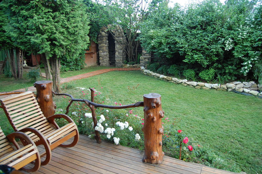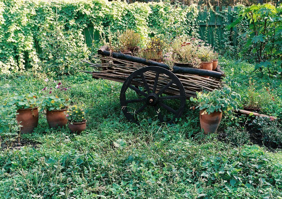 A pesar de este arreglo, todo parece pintoresco: un jardín delantero con margaritas, acianos y árboles frutales con colmenas.Las plantas plantadas al azar encajan perfectamente en el paisaje rural. Los objetos a su alrededor parecen obras de la naturaleza: una tienda hecha de enganches o un árbol aserrado, una cerca entrelazada con un seto, una puerta.
