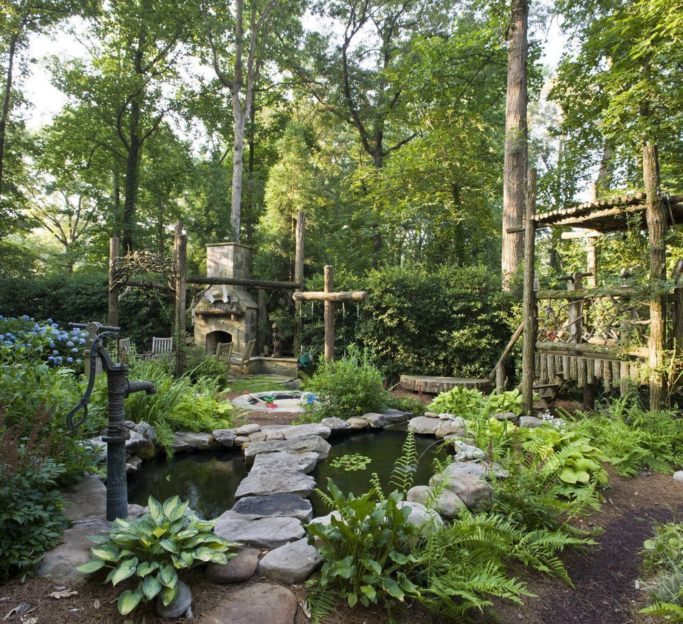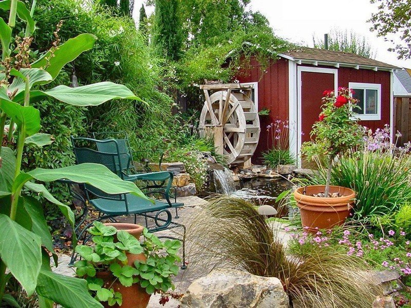 El estanquePara tal jardín, la opción más adecuada. Puedes equipar un estanque impermeabilizado, un pozo. Si no hay fondos, es suficiente enterrar un barril de madera o un baño viejo en el recinto. Planta con cañas, lotos y ninfas. Emitir territorio costero con hierbas: juncia, festuca, miscanto. Tal estanque se verá espectacular.