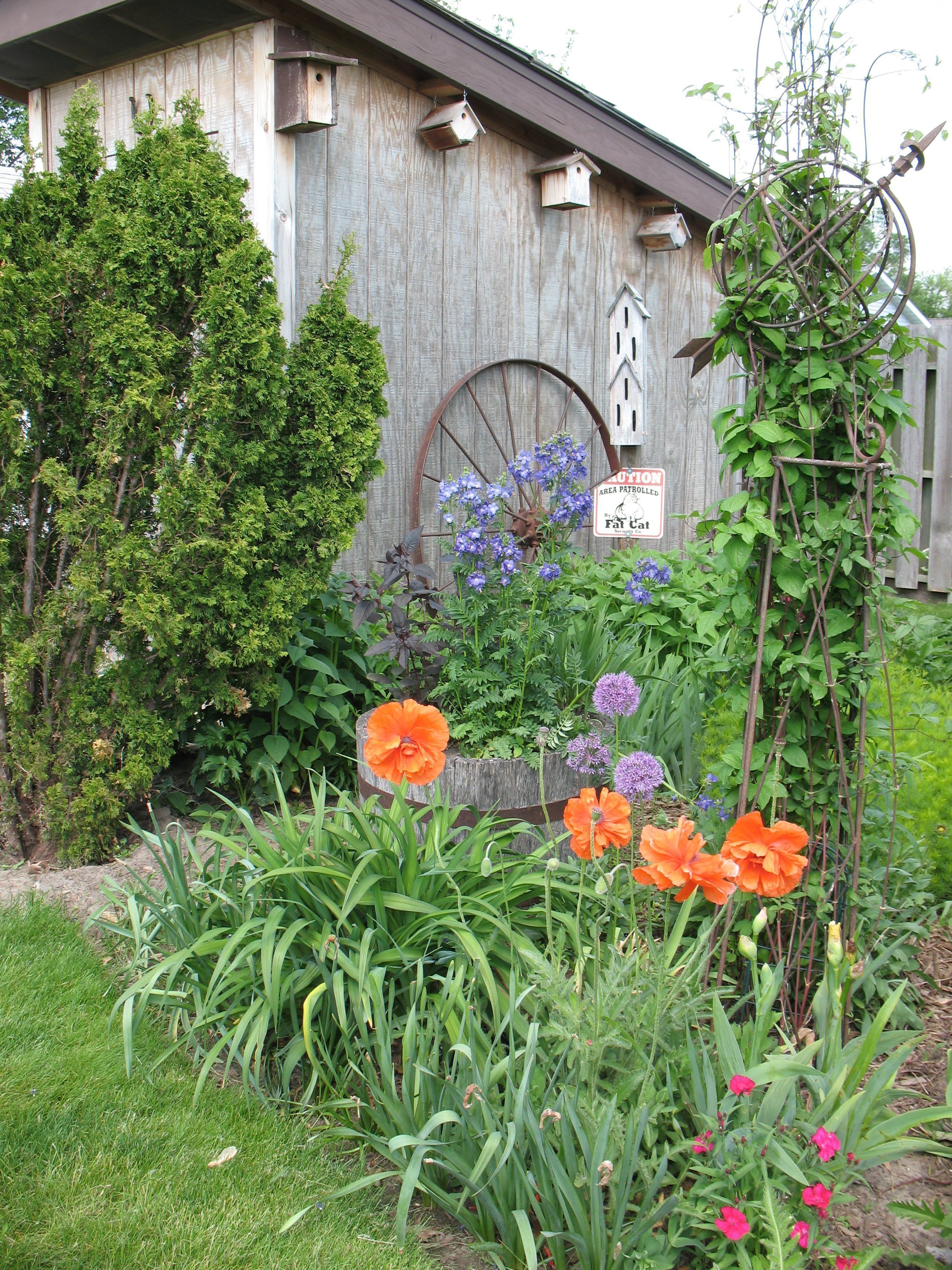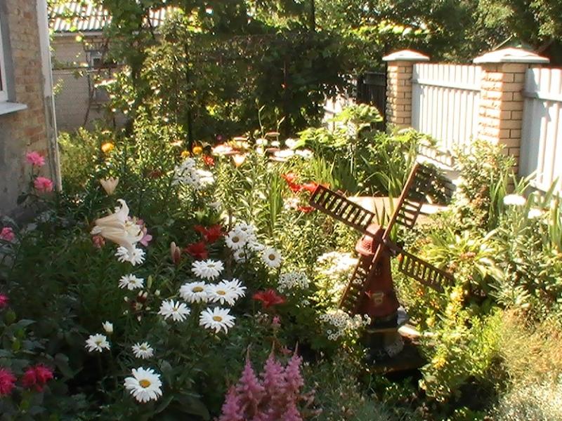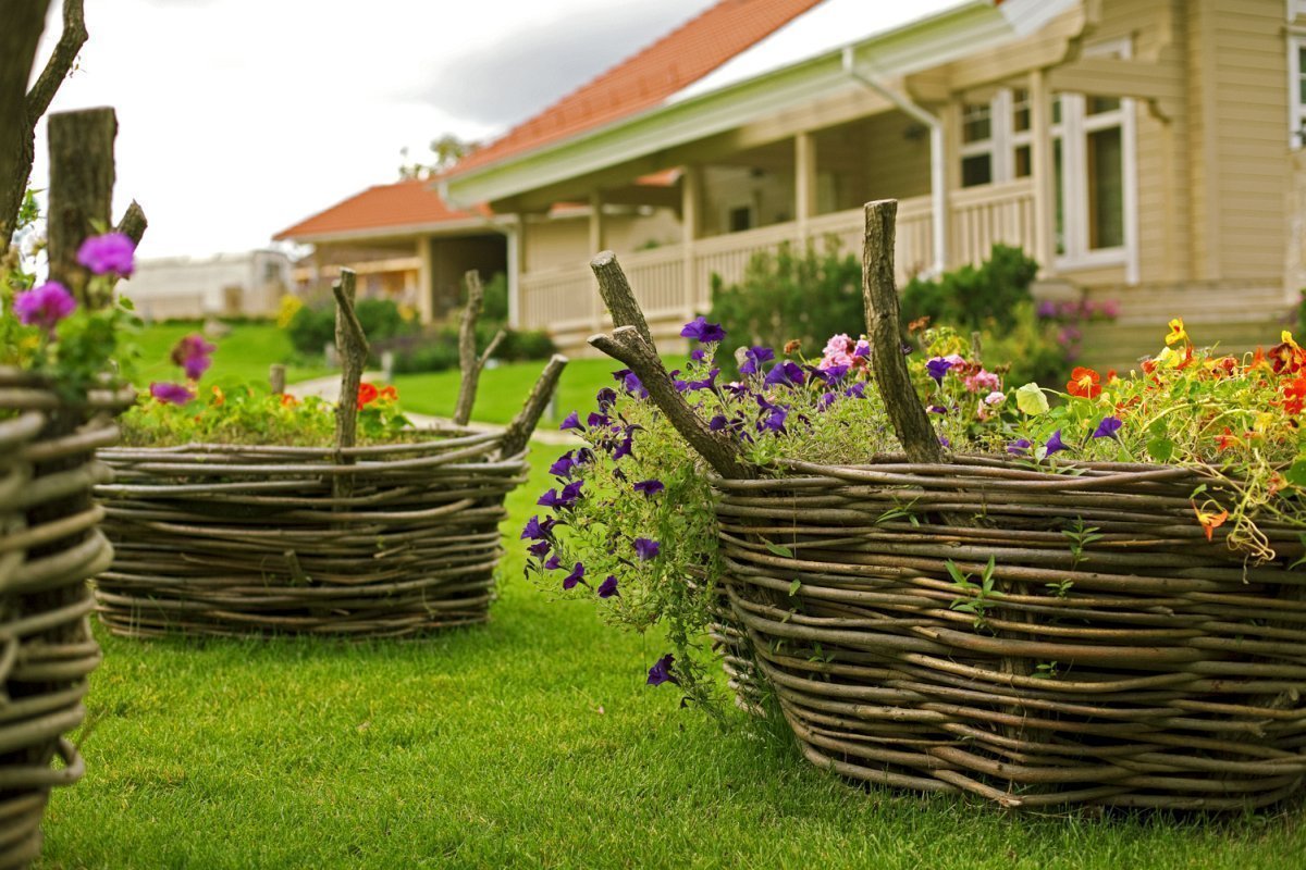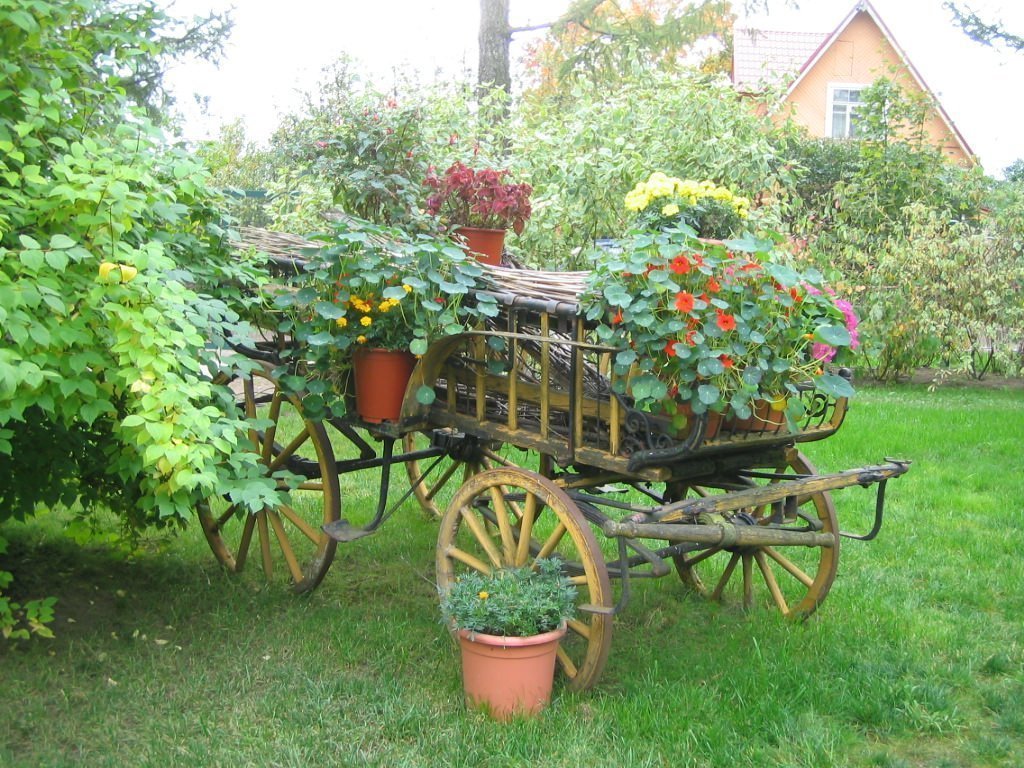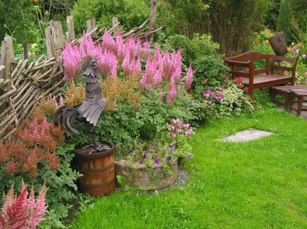El objetivo principal del jardín rural es crear la impresión de la vida silvestre. Por lo tanto, solo se utilizan materiales naturales. Alrededor hay flores abigarradas sin pretensiones: malva, crisantemos, dicentres, lirios, azucenas, dalias, violetas, claveles. Concéntrese en plantas brillantes con formas redondas de inflorescencias. Por ejemplo, un lazo decorativo se ve bien con geranios, un brazalete. Las rosas trepadoras, las clemátides y las madreselvas son adecuadas para los setos.