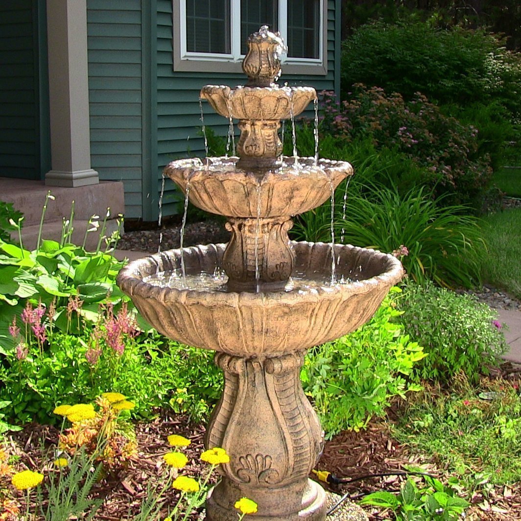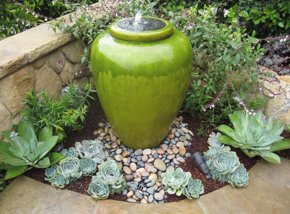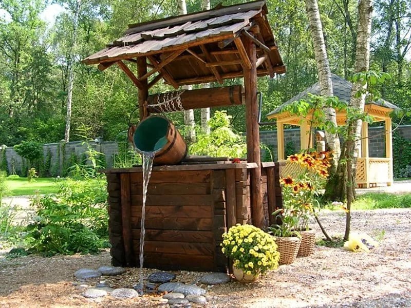 La fuente Diseño simple y al mismo tiempo fuerte. Puedes hacerlo tú mismo. Por ejemplo, coloque un comedero de madera debajo de una loma, cubra con piedras de diferentes tamaños y retire una tubería de agua.