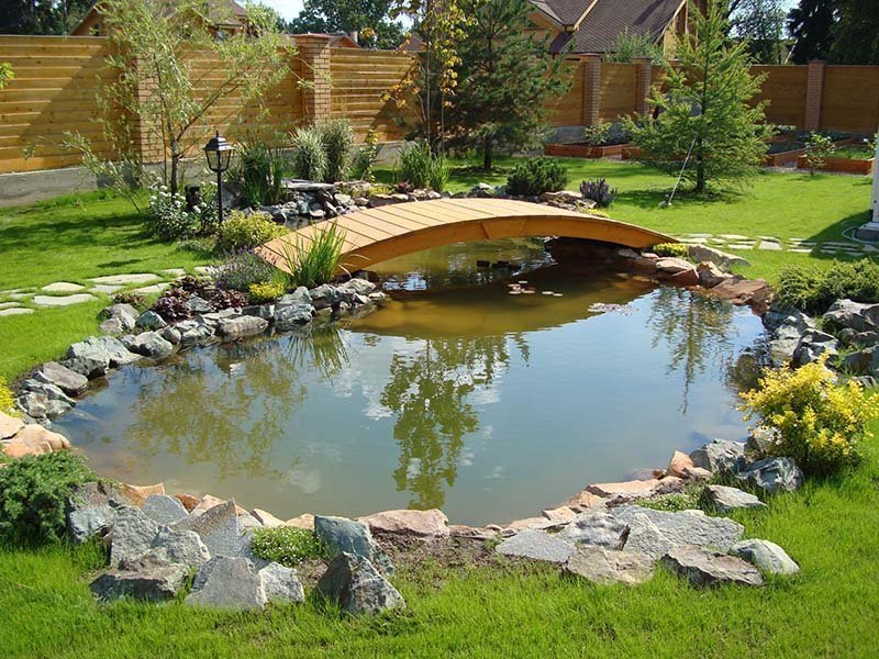No te dejes llevar por las piedras. Deben verse naturales en el medio ambiente. Si el estanque es ancho, las balsas o macizos de flores flotantes se pueden bajar al agua. Además, un puente hecho de troncos, ramas gruesas o un secador de abedul es adecuado para la decoración.