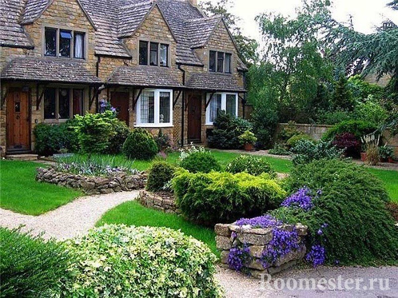 Naturalmente piedra, y también contrastes: una acera pavimentada de diferentes tonos entre sí, colores abigarrados de plantas, grava multicolor. Es muy conveniente si el sitio está ubicado en una pendiente, esto le permitirá superar el paisaje existente sin trabajo adicional. El estilo alpino implica la presencia de caminos sinuosos, muros de contención, todo tipo de estructuras de piedra y terraplenes de grava. Una imagen completa del sitio forma un complejo de paisaje único.