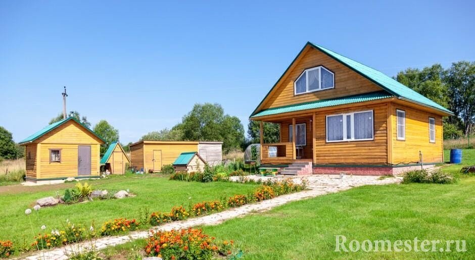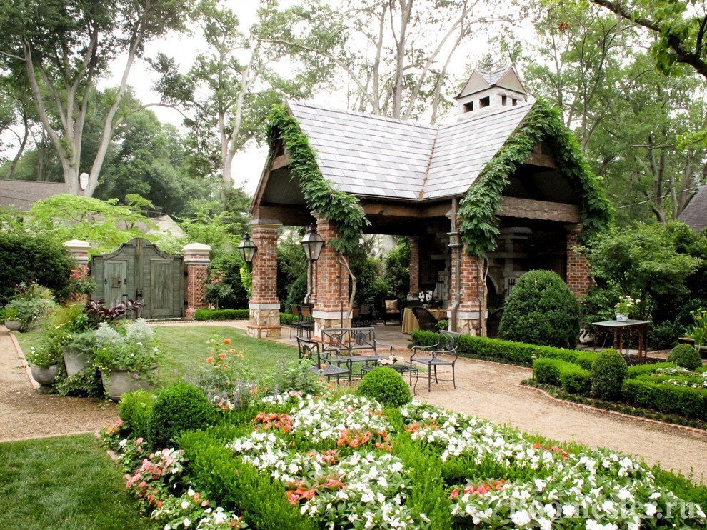 Los cenadores, cobertizos y otras dependencias que están completamente enterradas en flores y vegetación se ven hermosas en el sitio. La solución original serán pequeñas casas decoradas con mosaicos multicolores de vidrios rotos. Además, los edificios se pueden decorar con macetas colgantes con flores, pintura artística.