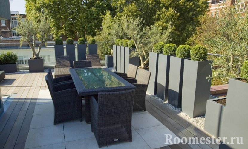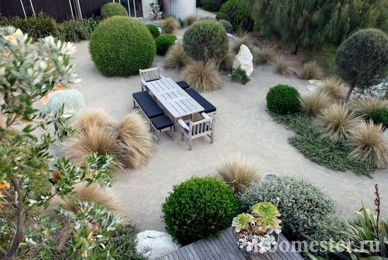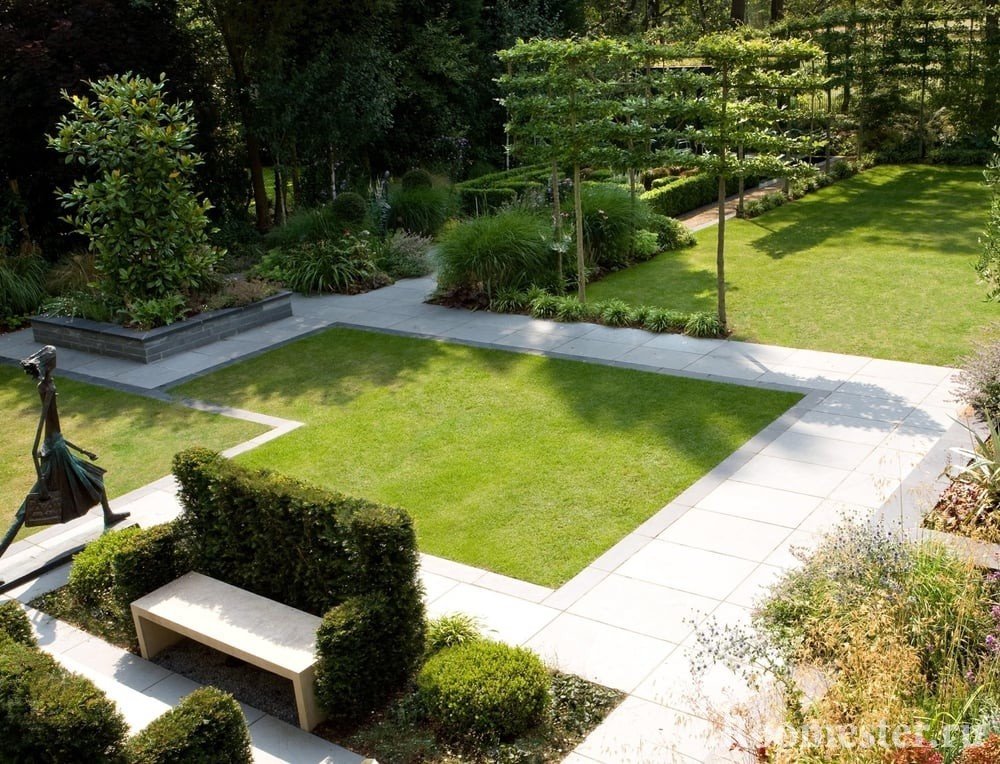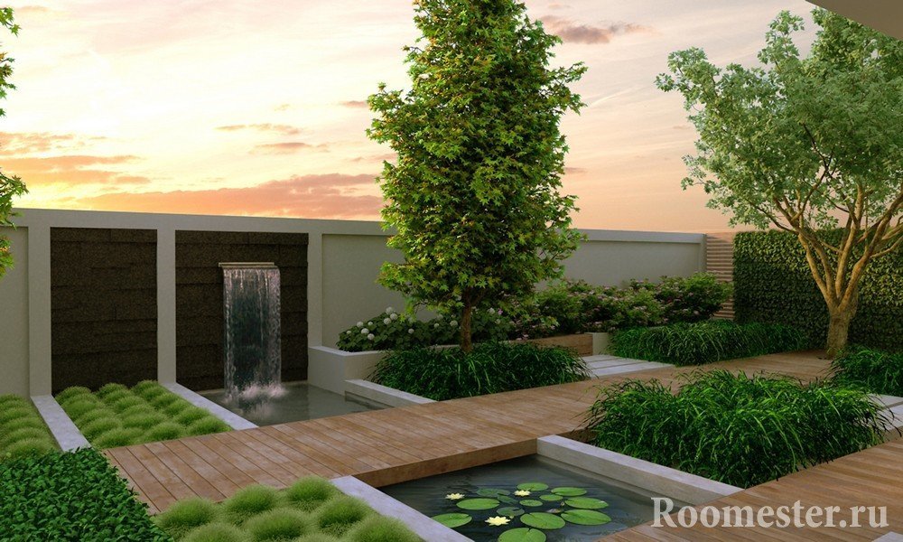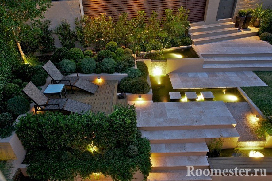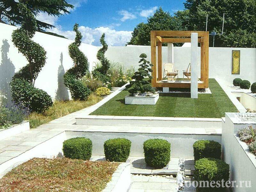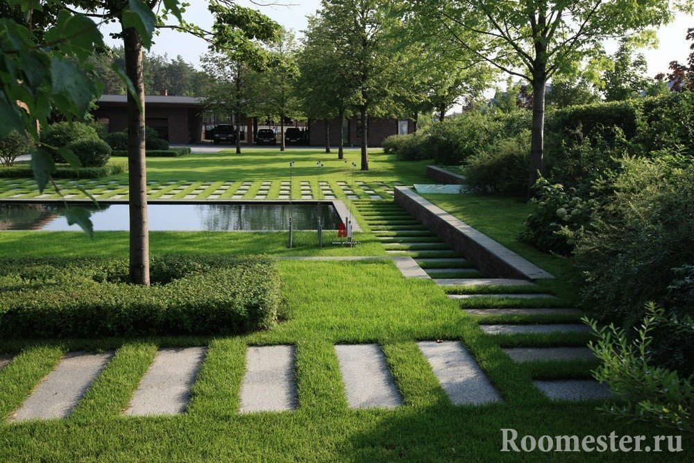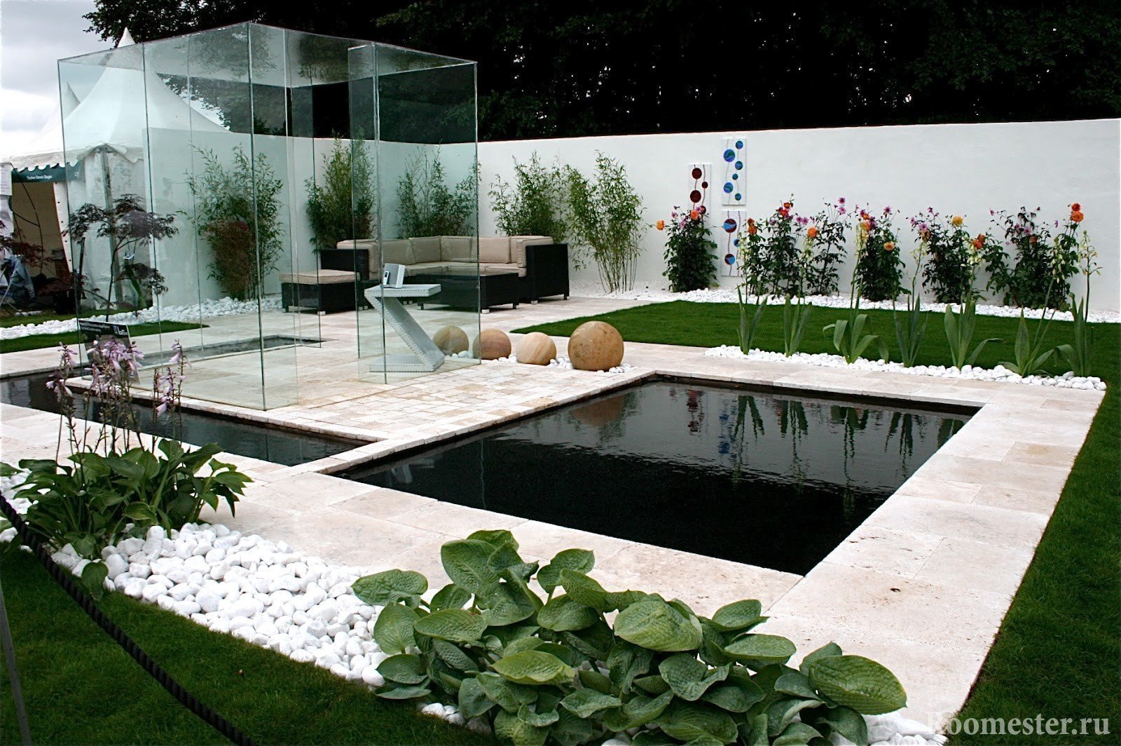 De los materiales utilizados piedra. Un mínimo de elementos decorativos y delicias arquitectónicas en el sitio se compensa con espacios verdes de formas regulares. Todo está interconectado y armoniza perfectamente entre sí, lo que hace que este estilo sea único. La presencia de un depósito es bienvenida, pero también hay ciertos requisitos: el estanque y la piscina deben tener la forma geométrica correcta.