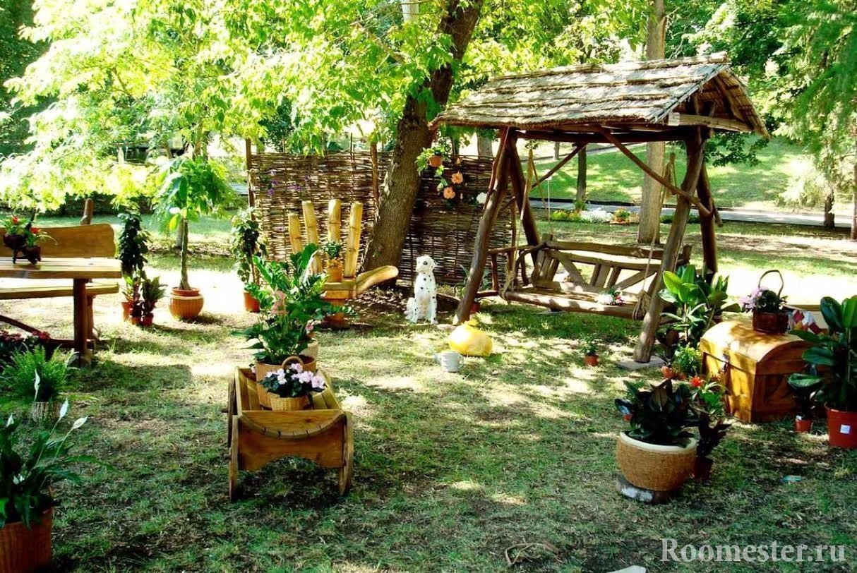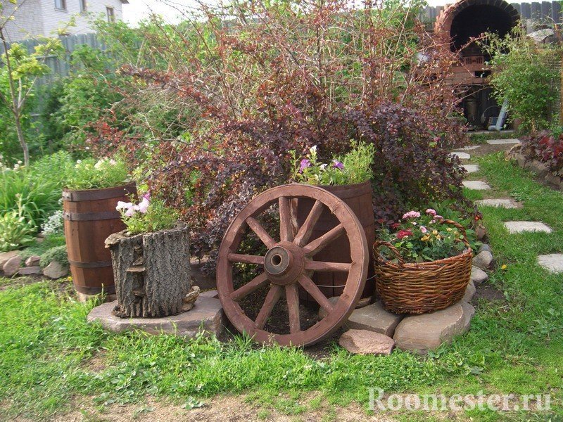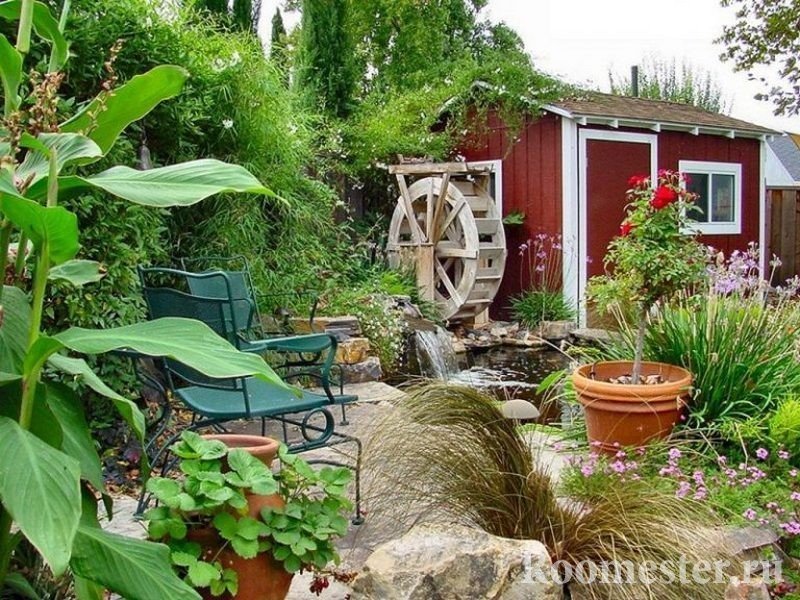 ¡IMPORTANTE! Al organizar un jardín de patio en un estilo rústico, debe adherirse a un cierto apego a una región en particular. No debe mezclar etnicidad y vida de diferentes nacionalidades, es mejor mantener de manera competente una sola línea.