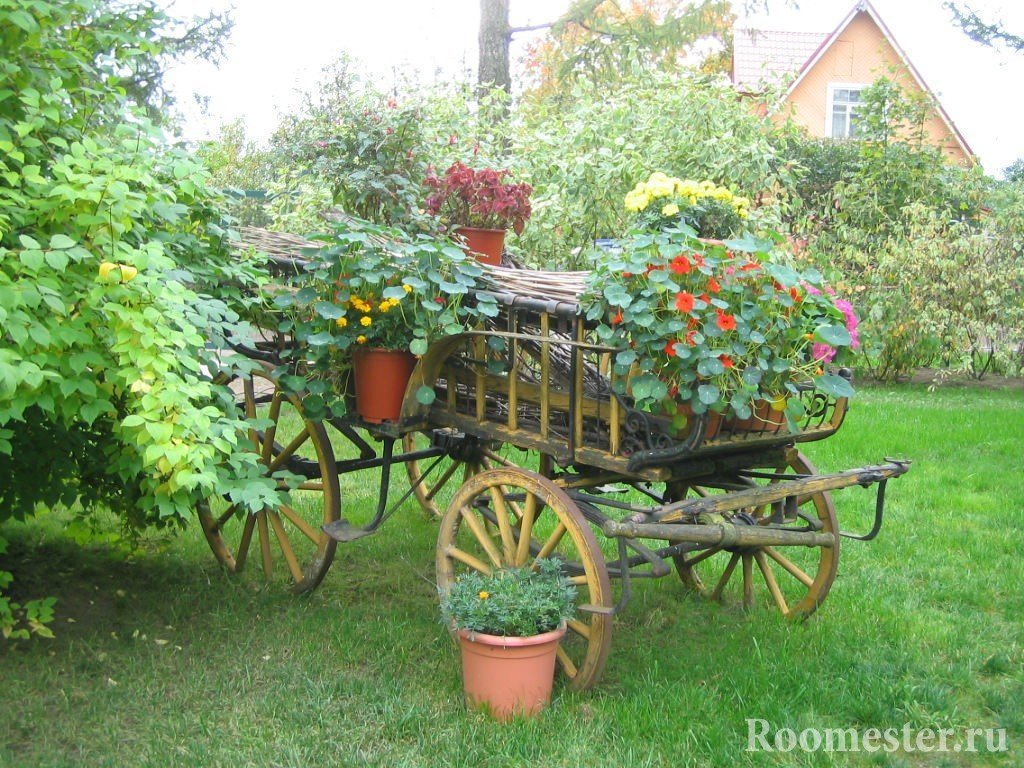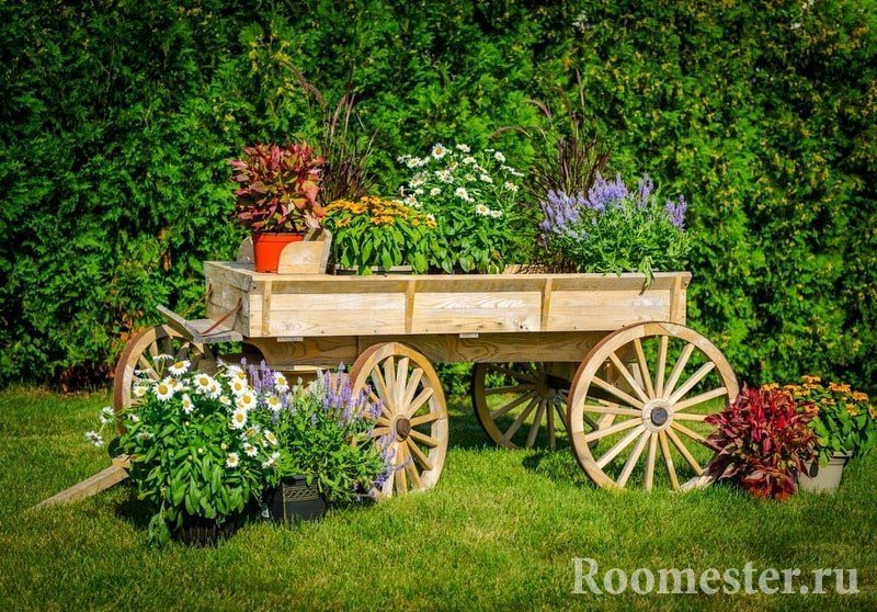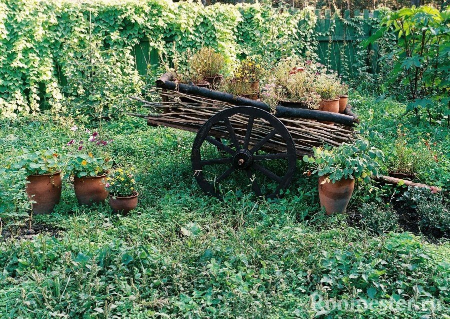 Una característica distintiva del estilo Country es que aquí puede aplicar toda la amplitud del vuelo de la fantasía. Para equipar la parcela del jardín, encajarán las cosas que ya han cumplido su vida útil. Puede ser: cestas de mimbre, macetas, macetas de barro colgadas en el zarzo. Para crear cercas y macizos de flores, una enredadera, ramas de árboles secos son muy adecuados. Para la disposición de pistas con piedra natural, adoquines, guijarros, baldosas cerámicas.La rueda de madera del carro, el pozo de acción o decorativo solo enfatizan la belleza del diseño. Los bancos de madera brillante, así como los pequeños taburetes pintados, serán apropiados junto a un estanque artificial cubierto de juncos.