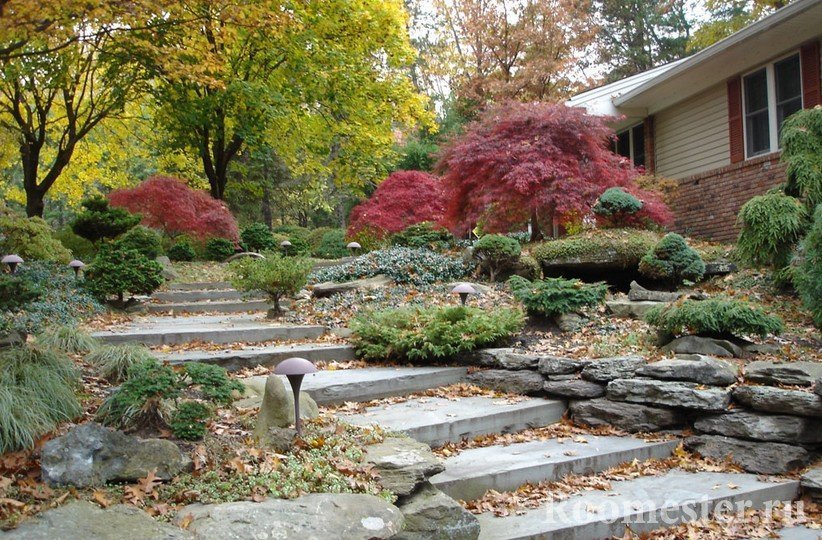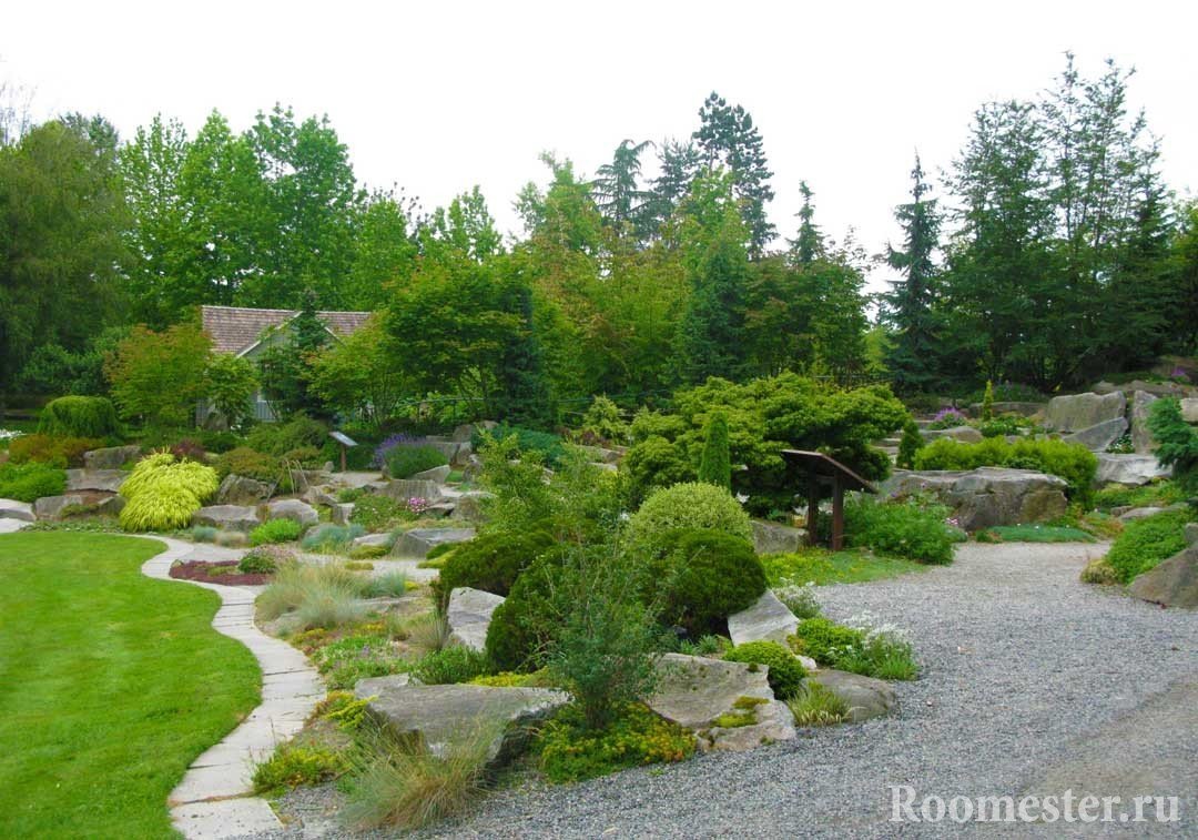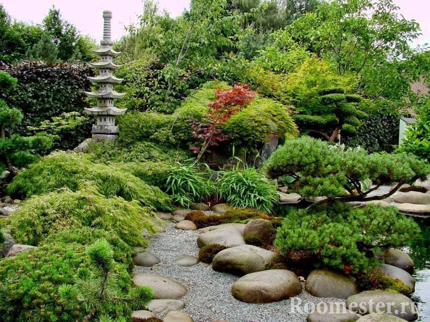 Todos los elementos utilizados para crear el jardín de estilo japonés tienen líneas asimétricas. Senderos y macizos de flores de formas irregulares, pero mantienen el equilibrio en la imagen general prevaleciente. Las transiciones suaves sin líneas claramente definidas están bellamente entrelazadas y crean un conjunto único. En este caso, el área de la parcela no importa, el jardín japonés se puede dividir en un área pequeña. Los espacios verdes se plantan a lo largo de las vías fluviales de los estanques artificiales, principalmente bambú, pino, enebro, manzanos ornamentales y, por supuesto, bonsai. Decora el jardín con toboganes alpinos, montañas rocosas, jardines de rocas y campanas sonando en el viento.