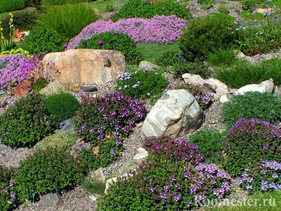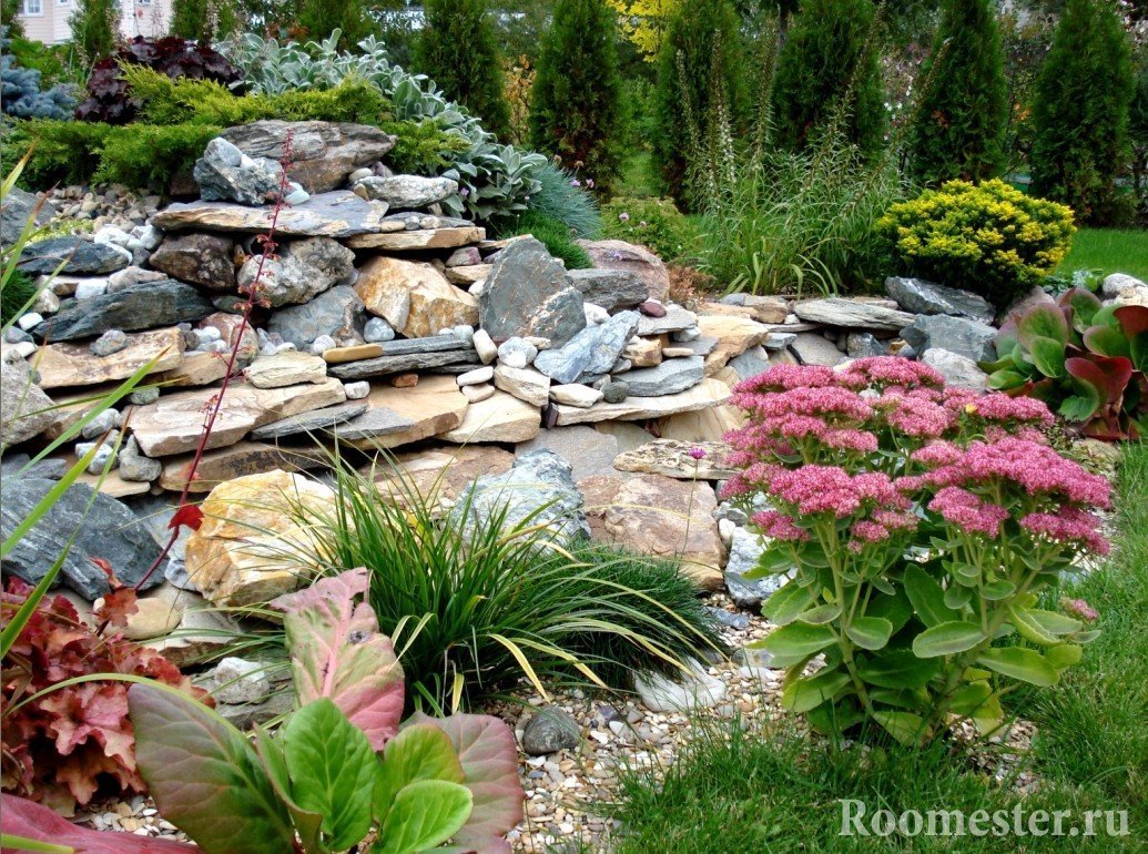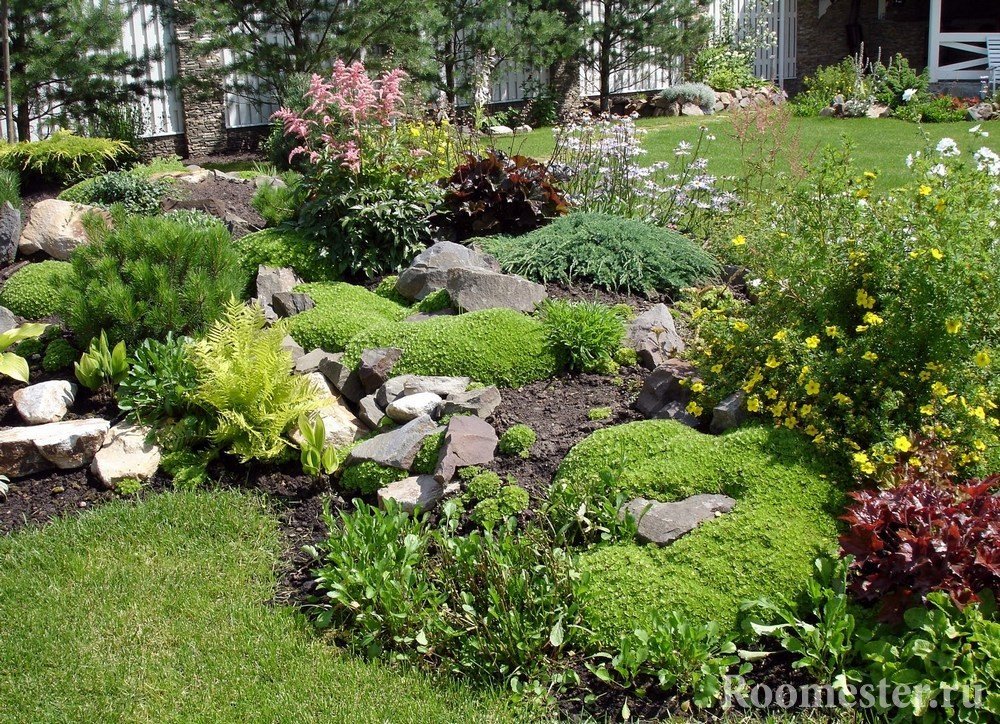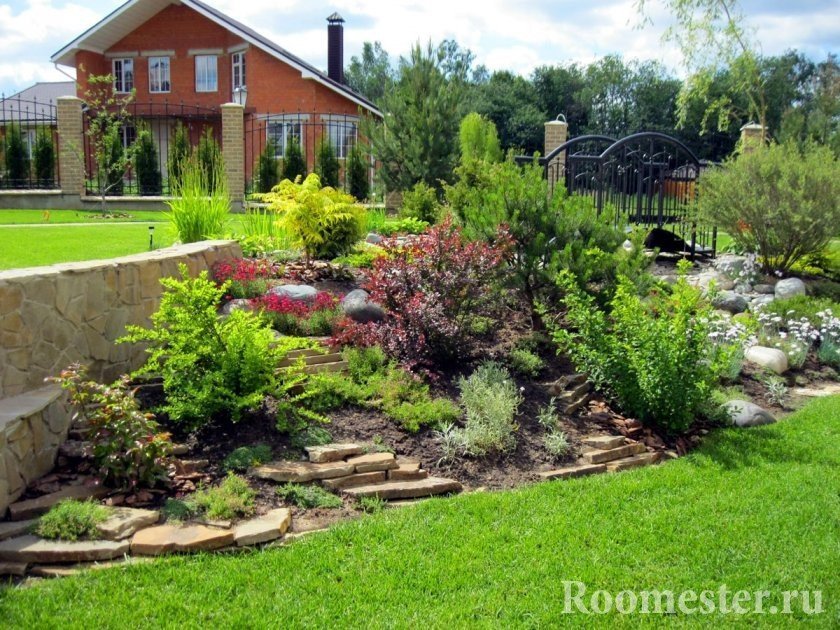 Las plantas se plantan en el sitio principalmente de hoja perenne, por ejemplo, las coníferas recrean y repiten la naturaleza del terreno alpino. Adecuado para paisajismo: enebro piramidal, tuya, pino, especies de árboles enanos, musgo, brezo.Todo tipo de estanques se ven geniales: cascadas en cascada, pequeños arroyos, estanques artificiales. Para macizos de flores, es mejor usar plantas perennes, características de las montañas. La jardinería suaviza las transiciones bruscas en un sitio elevado y también juega un papel importante en la zonificación del territorio.