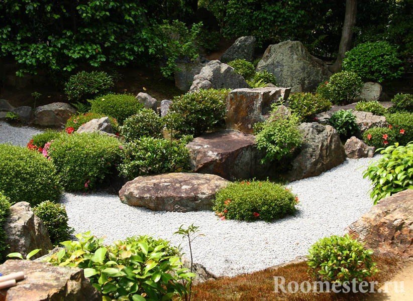 Como materiales utilizados para la disposición de los jardines Zen, se utilizan grava, arena, grava. El color de las plantas es principalmente verde, pero hay tonos de color rojo y blanco. La moderación lacónica reina en el sitio en un estilo oriental, la creación de un jardín de este tipo es toda una filosofía, a menudo lleva más de un año crearlo.
