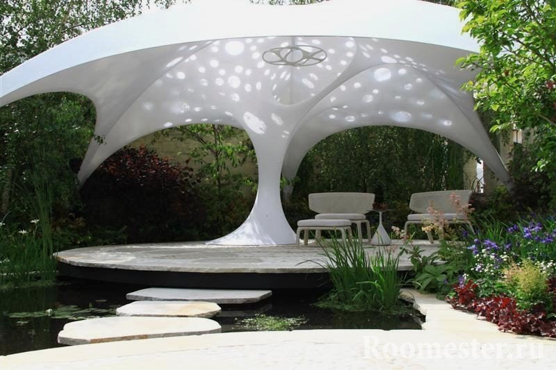 El estilo de alta tecnología implica la encarnación de las ideas más atrevidas, inusuales para otras áreas en el diseño del paisaje. La completa libertad de creatividad junto con el uso de materiales y diseños modernos contribuyen a la creación de una atmósfera única en el jardín. Aquí puede crear ilusiones ópticas utilizando iluminación decorativa, cualquier forma inusual. Las soluciones abstractas caracterizan mejor esta dirección de estilo. Los acentos pegadizos sobre un fondo claro transformarán ventajosamente el sitio, dándole singularidad y expresividad.