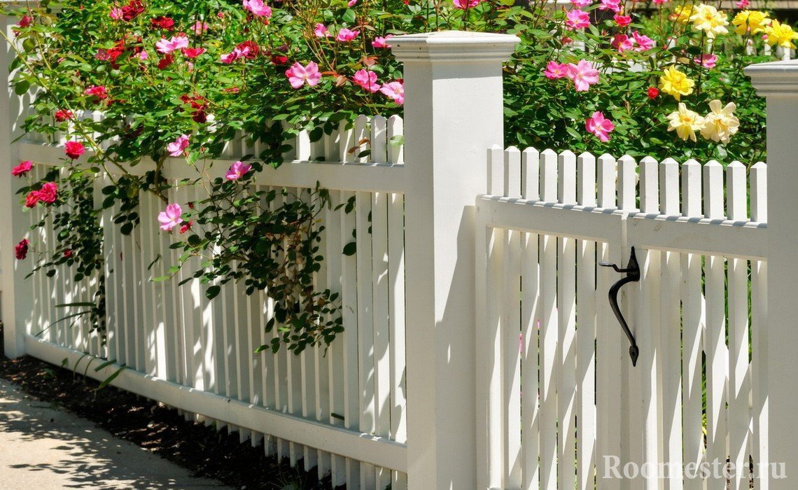 La cerca se puede decorar con macetas colgantes con flores frescas, o hacerla en capas. La última opción implica varios niveles escalonados a la vez, en los que se encuentran los setos, formando una sola composición, se ve maravilloso.