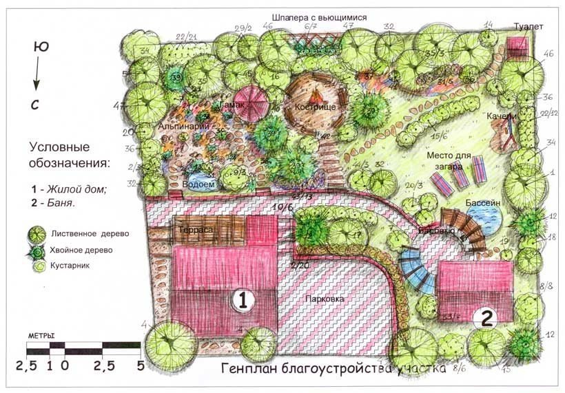 Luego es necesario calcular la ubicación del agua subterránea, marcar los puntos más cercanos a la superficie. Para establecer comunicaciones de ingeniería y plantar árboles solo puede guiarse por estos indicadores geodésicos. De lo contrario, el agua puede destruir el árbol y el árbol con sus raíces: comunicaciones. El nivel de ubicación del suelo también jugará un papel. La alta humedad del suelo acompaña a las tierras bajas. En una colina, se observará un microclima más seco. Esto también es digno de mención en el borrador del plan.