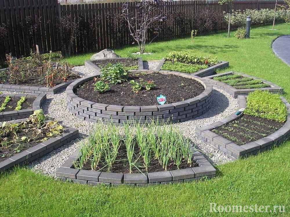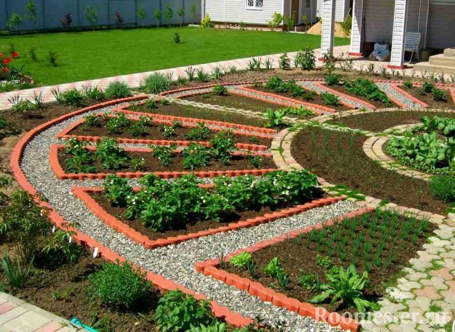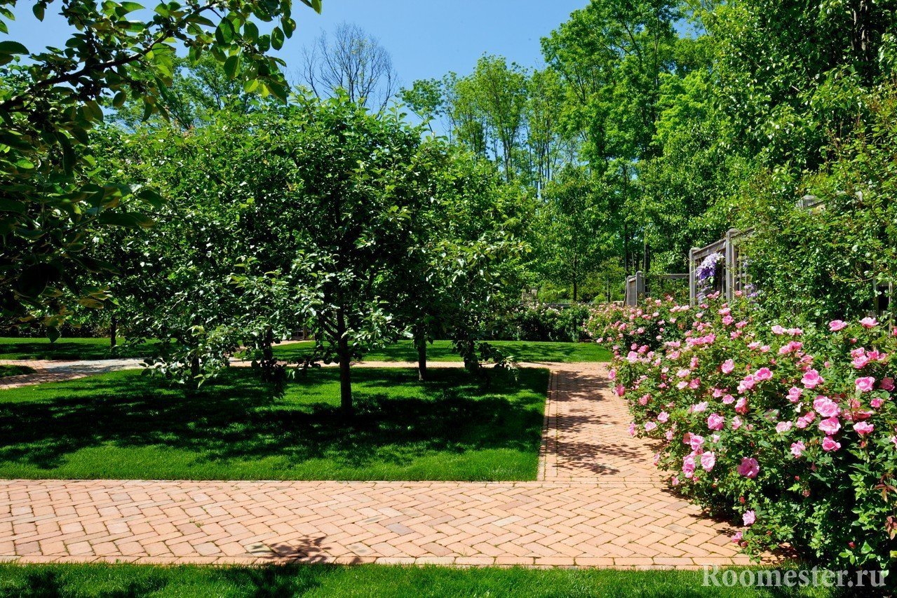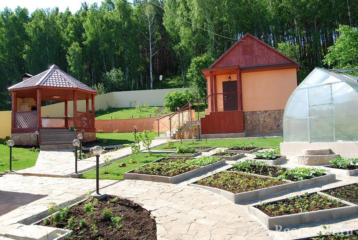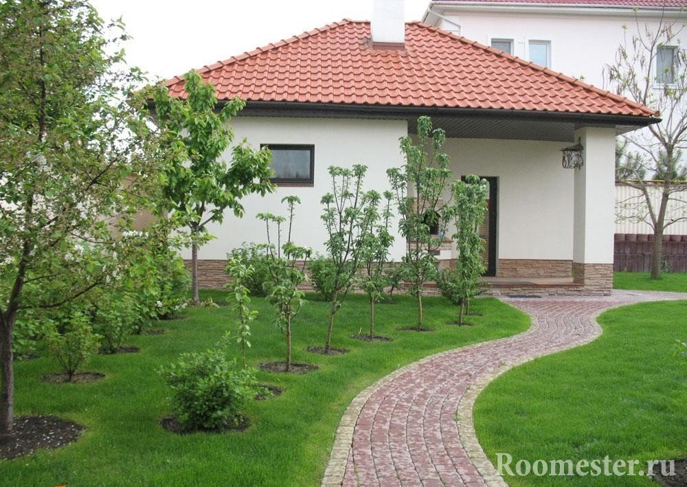 El área para el jardín. Pueden ser tanto plantaciones de árboles como cultivos de hortalizas en los lechos. Un diseño exitoso le permite colocar uno y el otro al mismo tiempo.