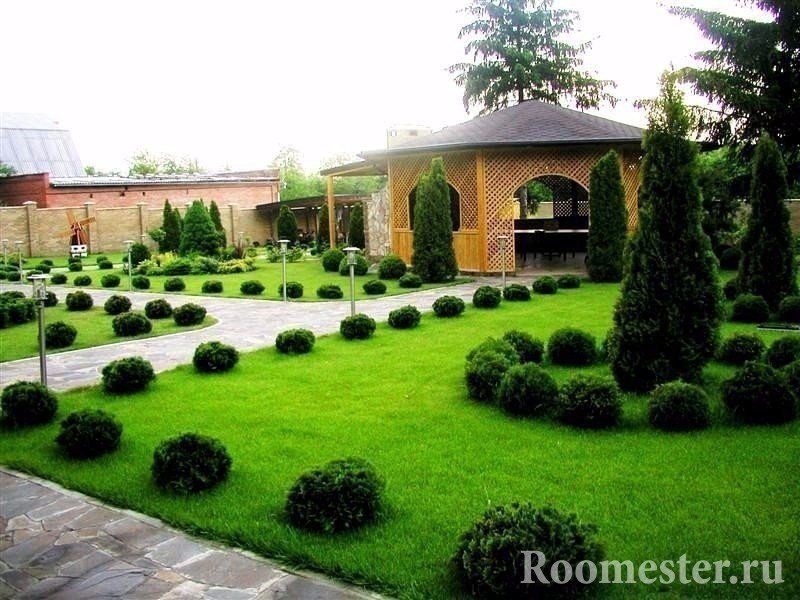 Para mostrar a tus amigos un rincón europeo para la relajación, tendrás que trabajar duro. No basta con poner mampostería y árboles con sombra. Es necesario comprender el arte de la modernidad, guiarse por las leyes de simetría al zonificar el área. Se debe dar preferencia a formas rectangulares perfectas. Los arcos exquisitos y los atributos elegantes de una época pasada pueden servir como un acento local. Esculturas antiguas, fuentes elegantes, cenadores de hierro forjado. Al elegir entre variedades de plantas, se debe tener en cuenta la necesidad de que una de ellas prevalezca sobre las demás. Pueden ser cipreses decorativos, arbustos altos. A diferencia de otras áreas, el espíritu de respeto por el pasado y el orden pedante es importante aquí. Todas las pistas deben ser planas o circulares, pero no serpenteantes. Protecciones: bien cuidado y anunciando el estado de los propietarios. Con la debida diligencia, la implementación de esta opción es bastante posible con sus propias manos.