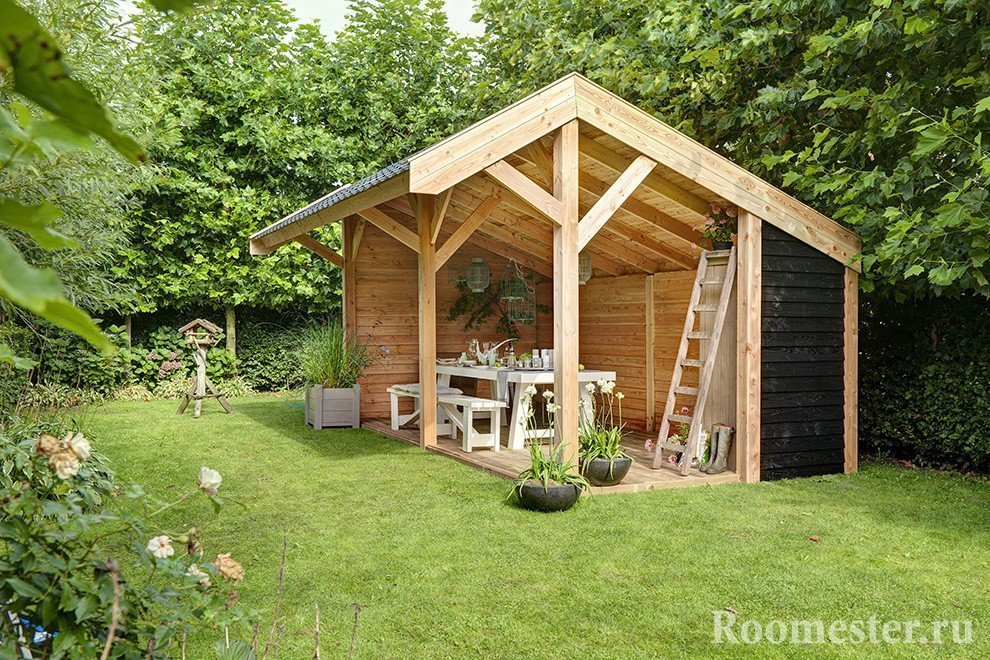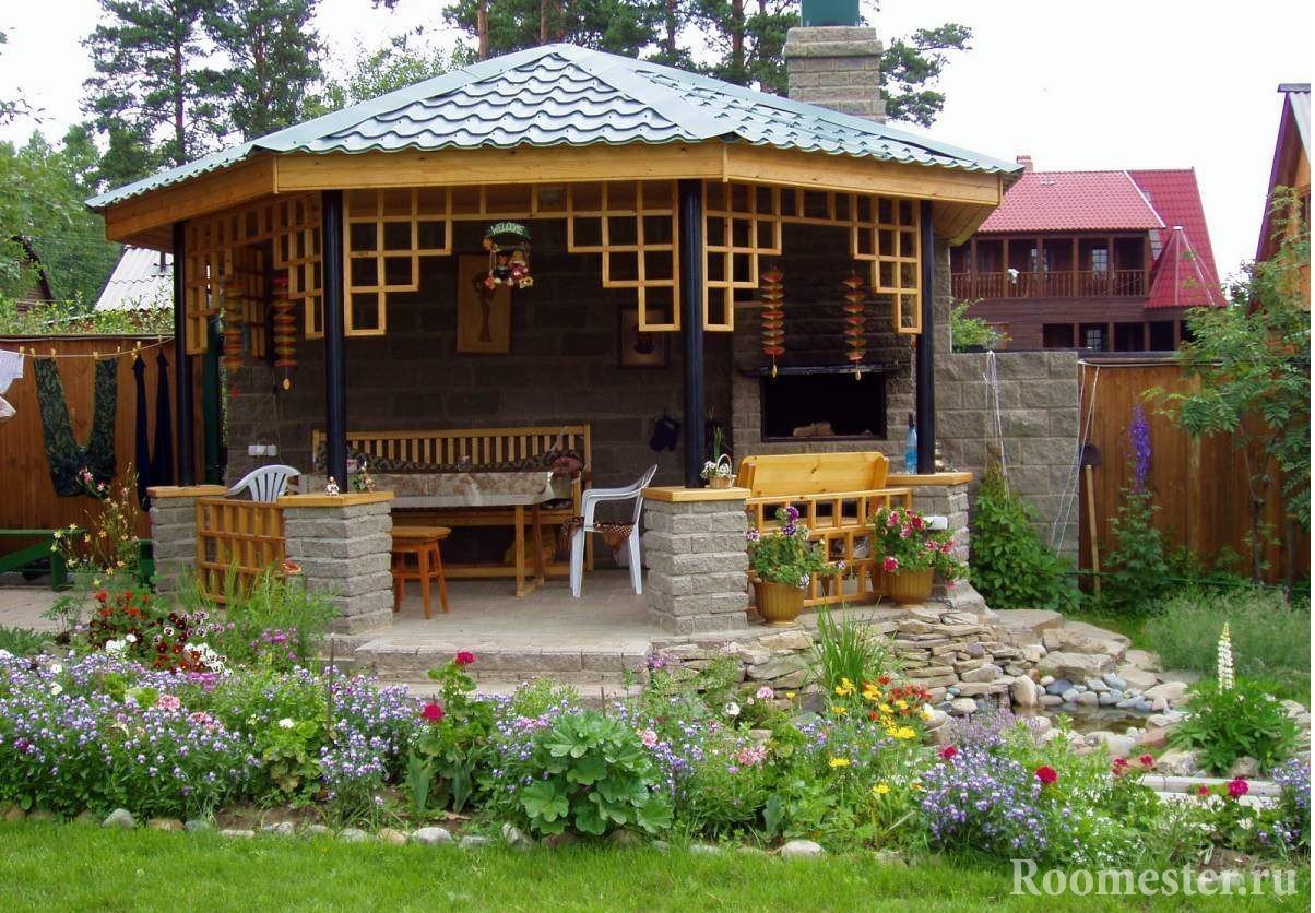 La disposición de estos edificios de jardines en un sitio determinado le permite relajarse a la sombra fresca en el caluroso verano y disfrutar de una lluvia bajo el techo de la capital. Es ella, junto con las aberturas de las ventanas, lo que distingue la glorieta de la pérgola. Dado que este último se caracteriza más probablemente por una cubierta de celosía que sirve para fines decorativos. A menudo está decorada con sinuosas uvas silvestres u otras plantaciones de tejido. También se permiten cestas colgantes con colores brillantes. Tal construcción sobre puntales ubica favorablemente el área de descanso del resto del territorio.