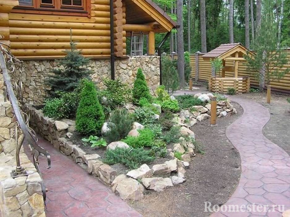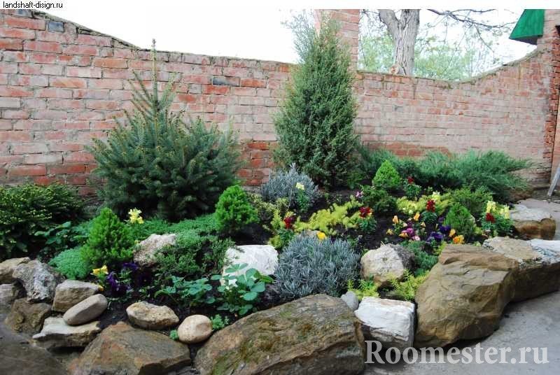 Estilo de paisaje. El propósito de este diseño puede ser crear unidad con la naturaleza local. Un vívido ejemplo de estilo puede servir como un diseño alpino con su imitación de las tierras altas. La idea de un paisaje natural no es nueva, pero siempre es ganadora. Se recomienda el uso de árboles de hoja perenne perennes, arbustos de coníferas, estanques artificiales. La corriente en combinación con macizos de flores de varios niveles se verá aún mejor. La mejor opción es organizar una rocalla con flores silvestres;