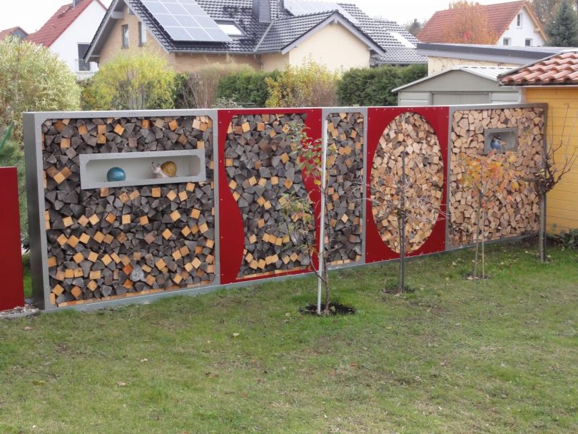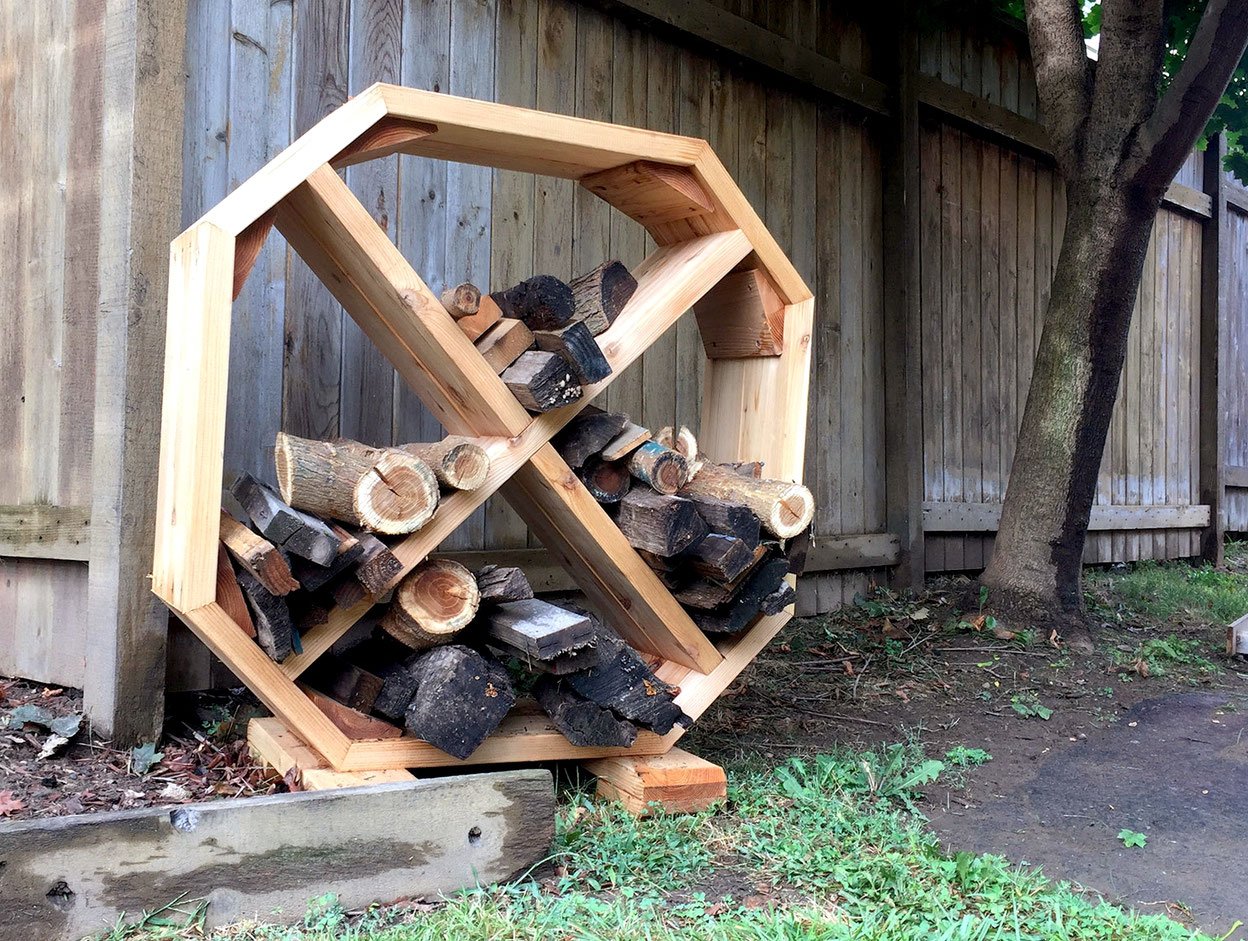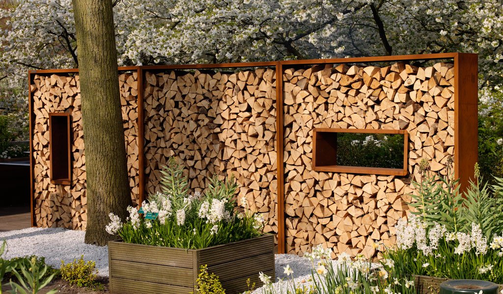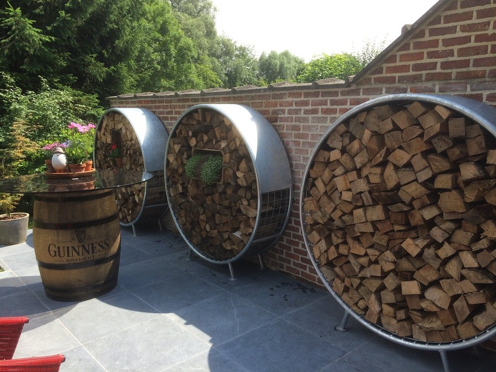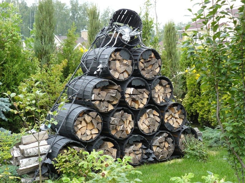Barril de madera: un elemento original del diseño del paisaje y la posibilidad de reutilizar contenedores ya usados.Se puede hacer separado o adjunto a la pared de la casa, dependencias. Los barriles se cortan en módulos cuya altura es igual a la longitud promedio de la pila de leña. Si el hombre de la leña es independiente, entonces el día ya no es necesario. Cada anillo debe estar conectado a los lados adyacentes. Si la estructura será soportada por la pared, entonces los módulos tendrán que fijarse en la parte inferior. Se construyen varias formas geométricas a partir de barriles (los más populares son los triángulos). Puedes usar recipientes de metal o madera. La madera se trata previamente con un antiséptico, que protege contra la humedad.