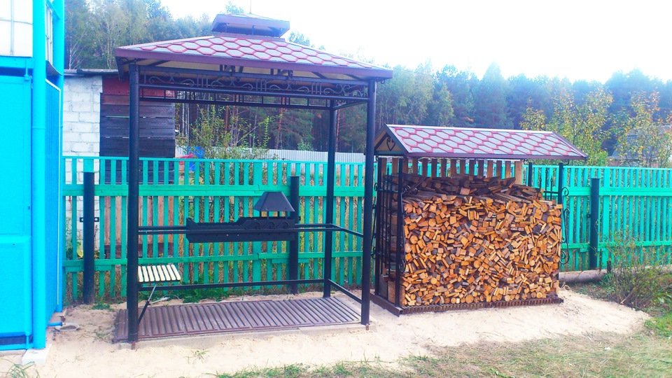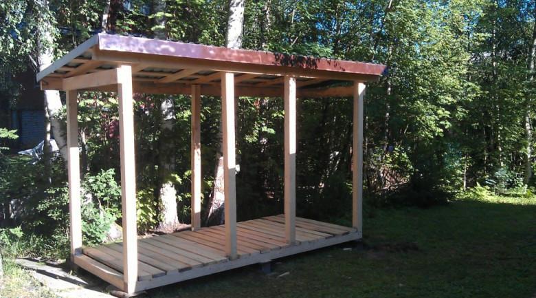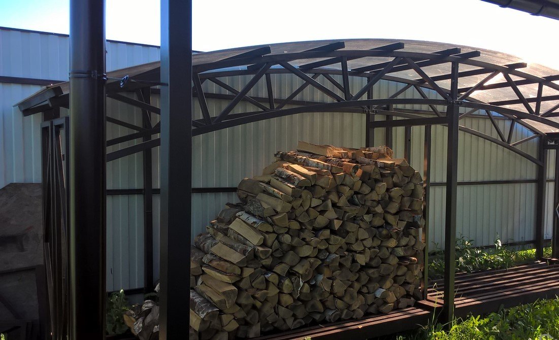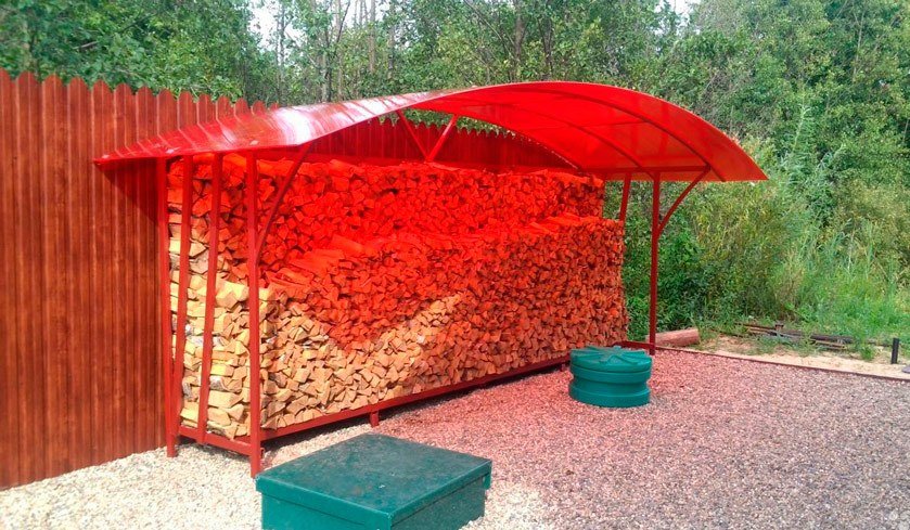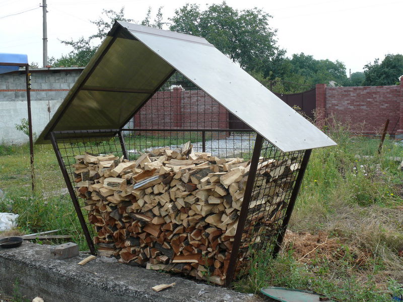 El marco de la leña puede ser de metal. Tal estructura durará mucho más que una estructura de madera. Pero no se recomienda cubrirlo con láminas de metal (revestimiento de acero, perfil de metal). En el verano, crean un efecto de horno interno, que no es deseable para la leña. El techo está hecho de pizarra, material para techos, policarbonato. Cualquier material que no permita que la humedad pase es adecuado para este propósito. El policarbonato puede revestirse y las paredes, pero es necesario dejar espacios para garantizar la libre circulación de aire.