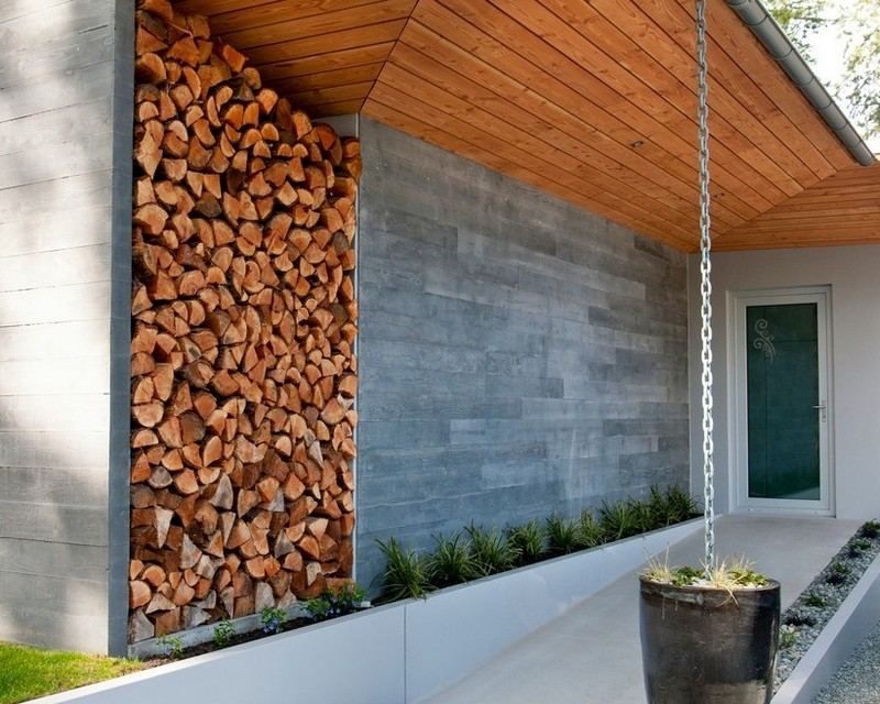 Por supuesto, el material más popular para la leña es la madera. La madera es fácil de adquirir y de trabajar, incluso sin habilidades especializadas. Tal edificio completo con una casa hecha de madera se verá orgánicamente. Por cierto, puede utilizar los restos de materiales de construcción para su construcción. Las paredes están hechas de tableros, losas, láminas de policarbonato. Se utiliza cualquier material que brinde protección confiable para las reservas de leña, excepto el metal. El hierro y el acero son buenos solo para el marco de la calle y las quemaduras de madera en interiores. Los diseños compactos son forjados. También hay opciones originales de los medios improvisados más inesperados: barriles, paletas (paletas de construcción), anillos de hormigón para pozos.