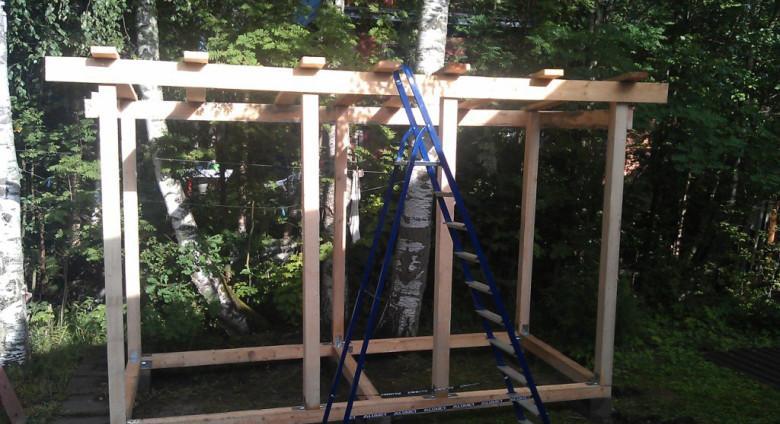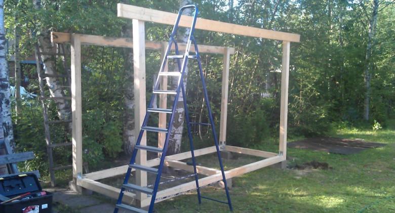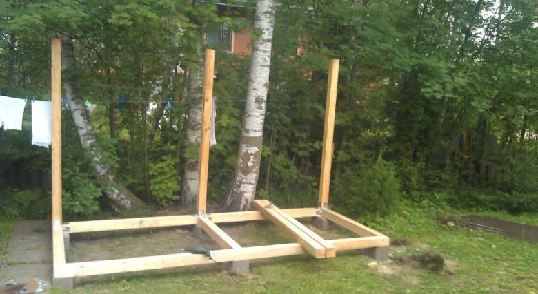 Desde el lado "sordo", las columnas se instalan más abajo, lo que proporcionará la inclinación deseada del techo. Ahora el marco está reforzado con vigas horizontales.