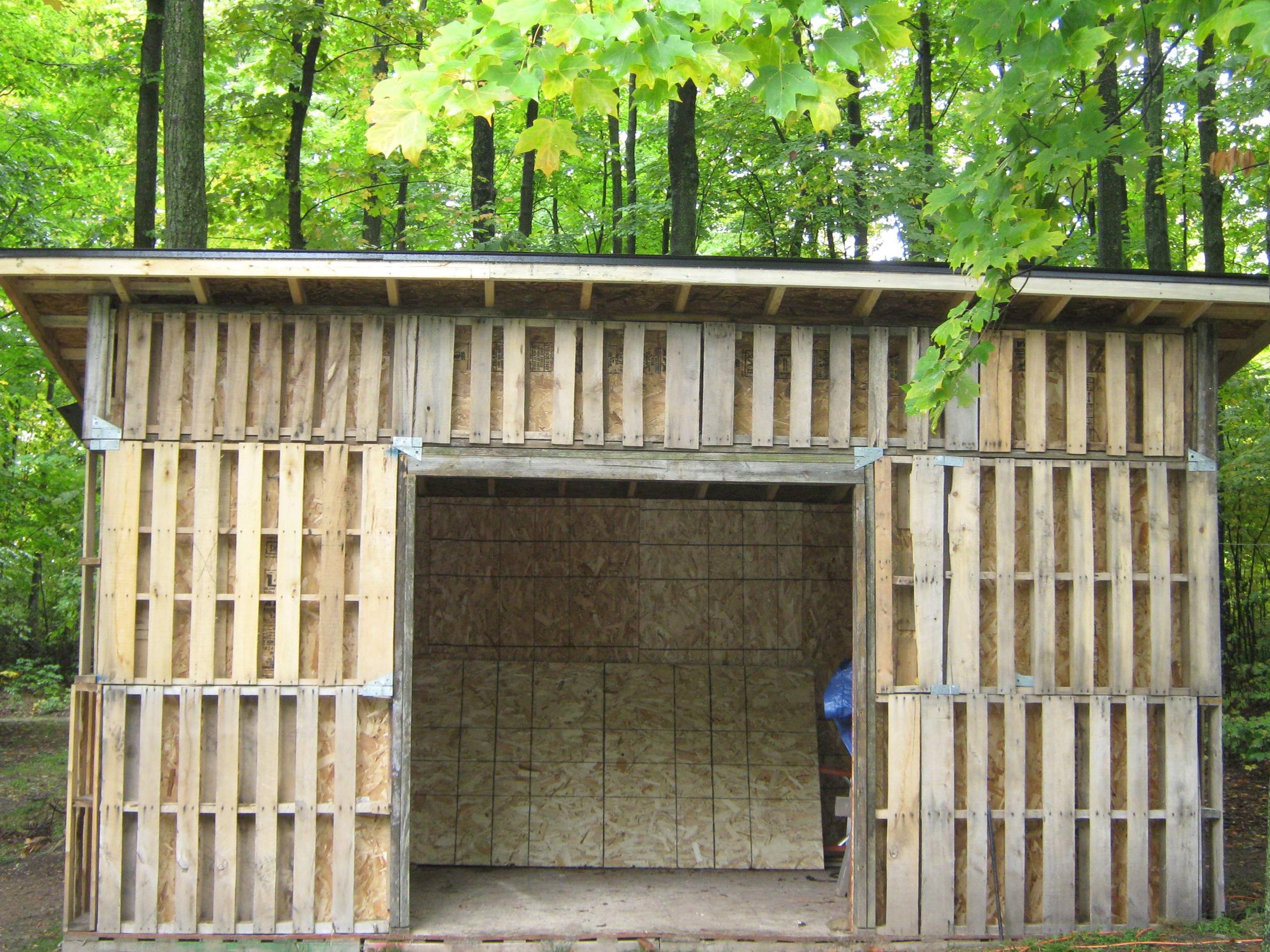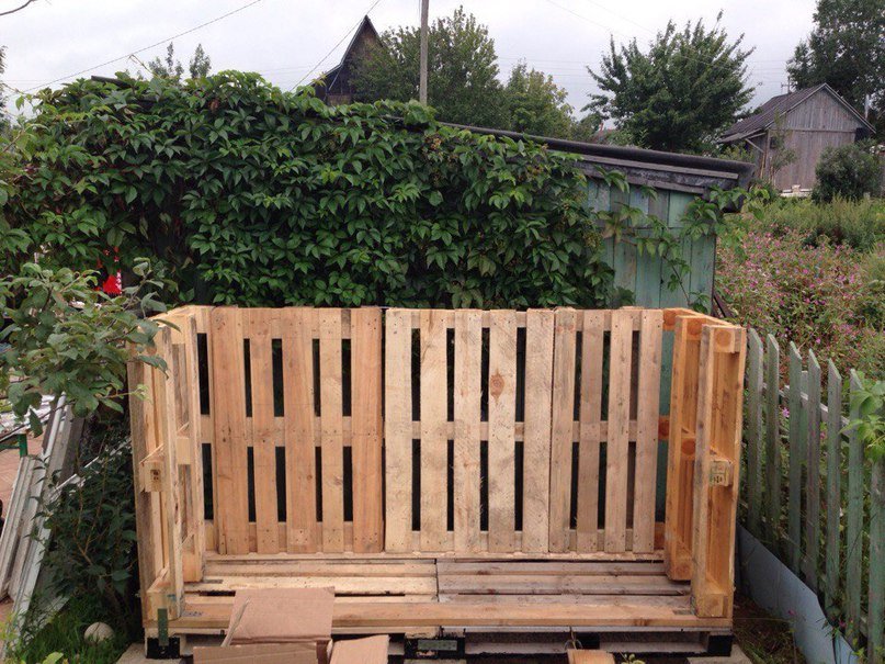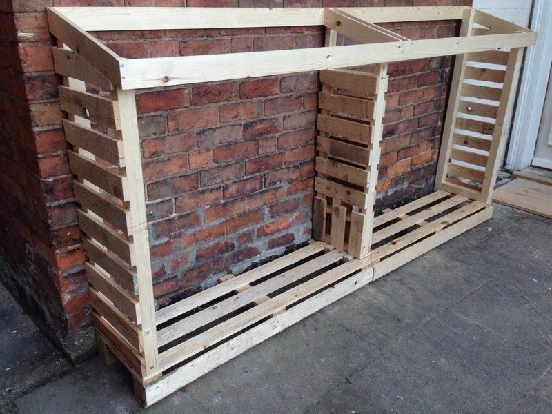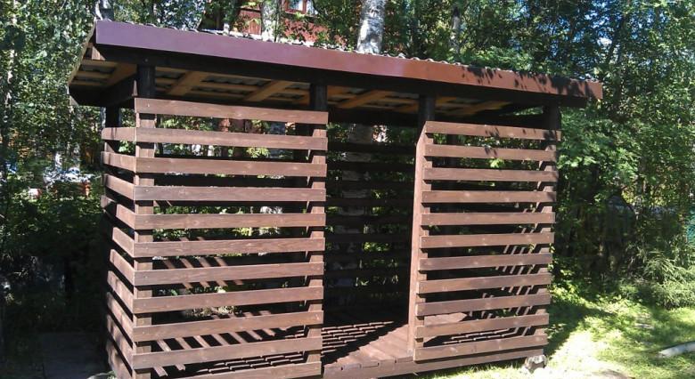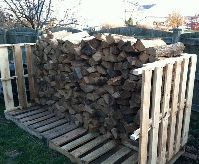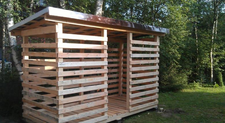 Una paleta de leña se ensambla como un constructor. La base de dos o tres paletas se fija con tornillos. Desde arriba está cubierto con una capa de material para techos. Las paredes laterales están construidas con paletas montadas verticalmente. Se pueden colocar incluso en dos filas, pero utilizando soporte adicional de los registros. En la parte superior se forma una celosía simple, que está cubierta de pizarra. Dentro de la estructura, se fija una malla protectora en las paredes. Desde las paletas, puede hacer otro modelo de leñador, más parecido a un estante de gran tamaño. Las paletas en este diseño desempeñan el papel de estantes.