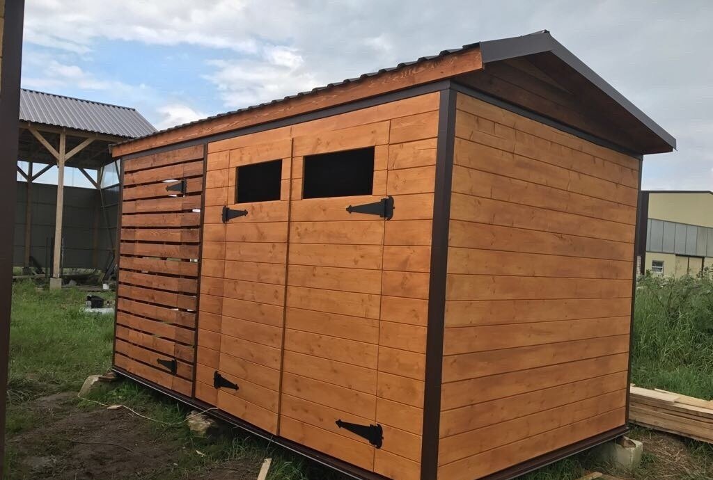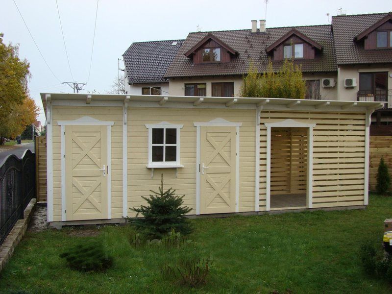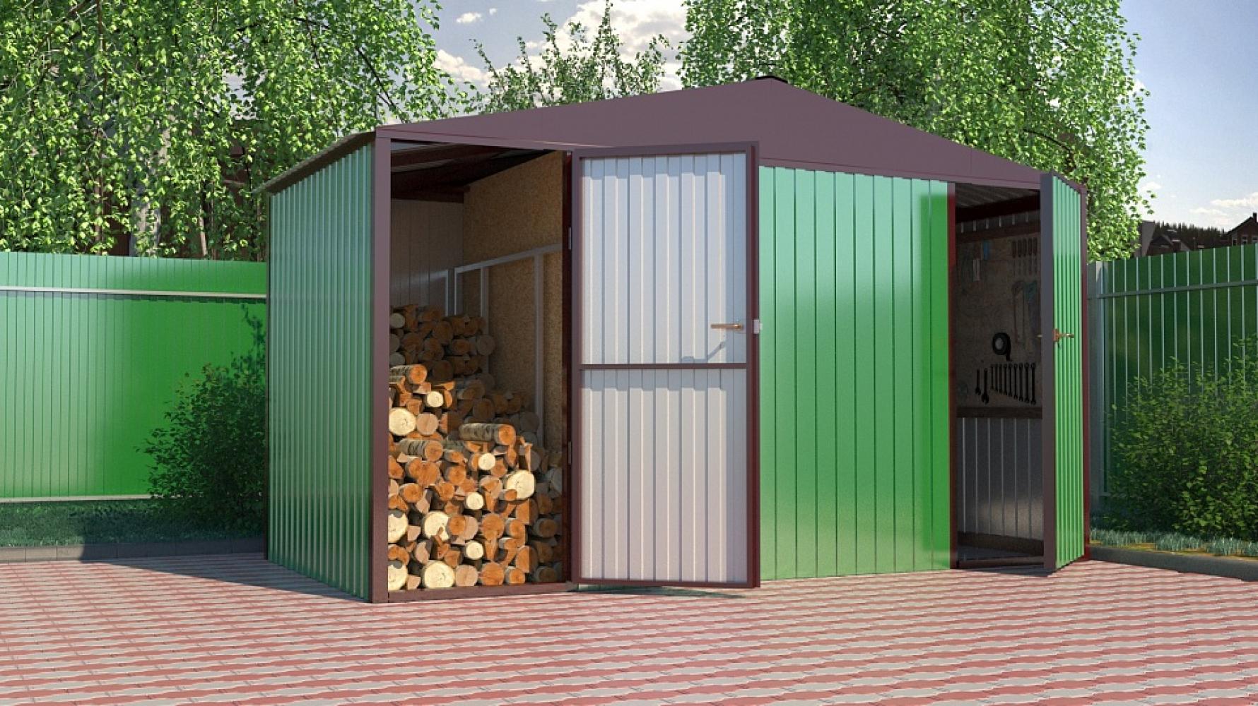 Drovnik, combinado con el bloque económico, se erige como un edificio separado. Primero, se coloca una base confiable, después de lo cual se ensambla el marco de la estructura. La construcción se divide en dos partes. Uno está completamente revestido con el material seleccionado (láminas de metal, tableros, láminas perfiladas), se coloca una puerta, se puede agregar una ventana, si es necesario. La segunda parte no está envainada, o solo está parcialmente cerrada, dejando huecos necesarios para ventilar la leña. No se necesita la puerta en el leñador, por lo que la abertura de entrada se deja "como está".