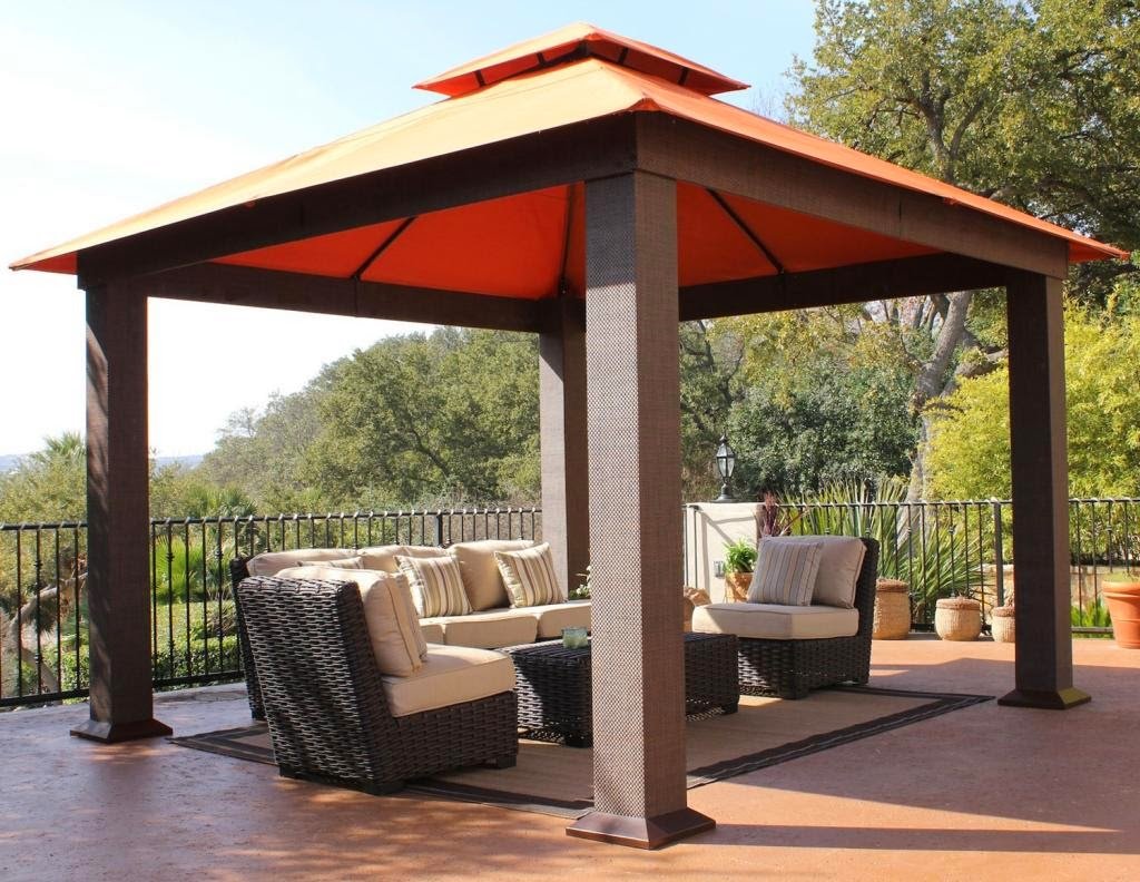 En un grupo separado incluyen toldos de gazebo. Pueden tener una amplia variedad de formas. Exteriormente se parecen a las carpas. Para la construcción no necesita una base, solo un par de soportes y directamente el "techo" de material ligero e impermeable.