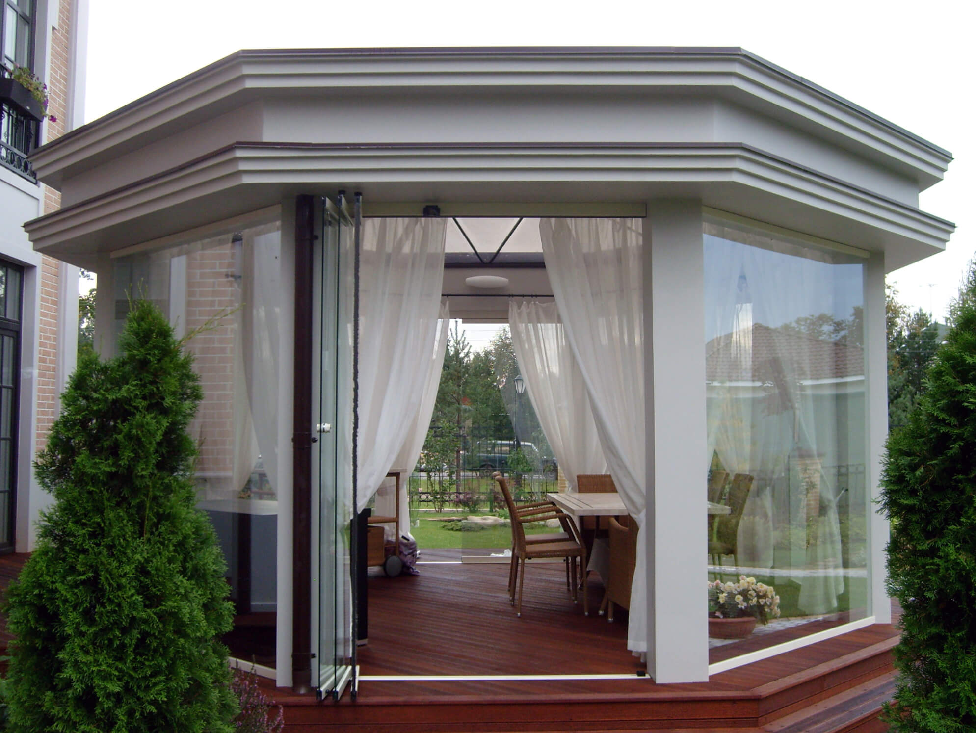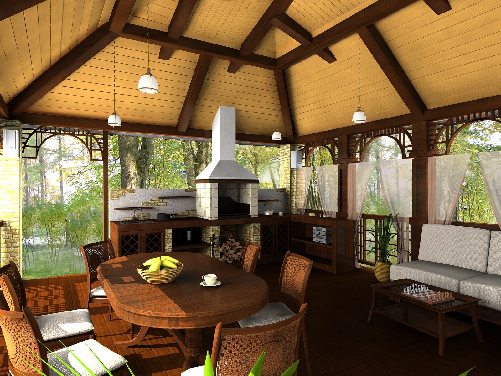 Como cualquier otra habitación, la glorieta debe ser dividida en zonas. La disposición correcta de los muebles es responsable del movimiento cómodo dentro del edificio. La lista de zonas principales incluye: