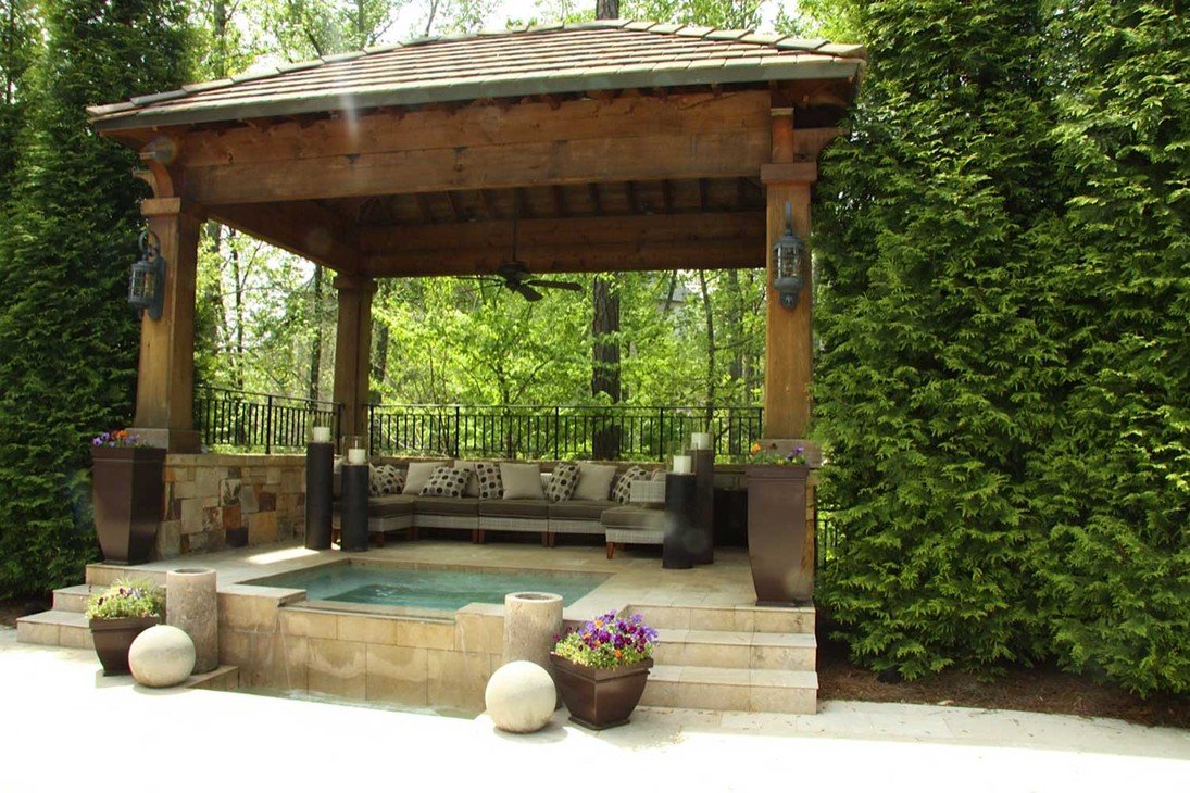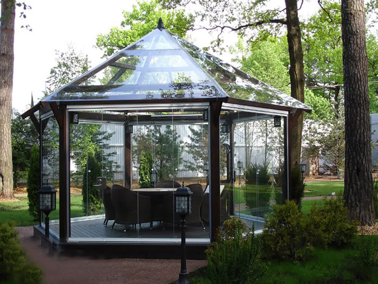 Cerrado Estos cenadores son más como casas en miniatura, separadas para descansar, pabellones. Tienen paredes y ventanas llenas. La principal ventaja de un edificio de tipo cerrado es la posibilidad de uso en cualquier época del año. Las paredes protegen de manera confiable del mal tiempo, el viento y las hordas de mosquitos. Sin embargo, algunos consideran este tipo de relajación "refinada", es decir, un sentimiento de cercanía con la naturaleza se pierde ligeramente en un espacio confinado. Por lo general, tienen chimenea o hogar, lo que proporciona una temperatura agradable en invierno.