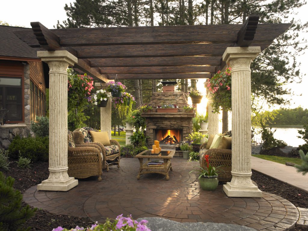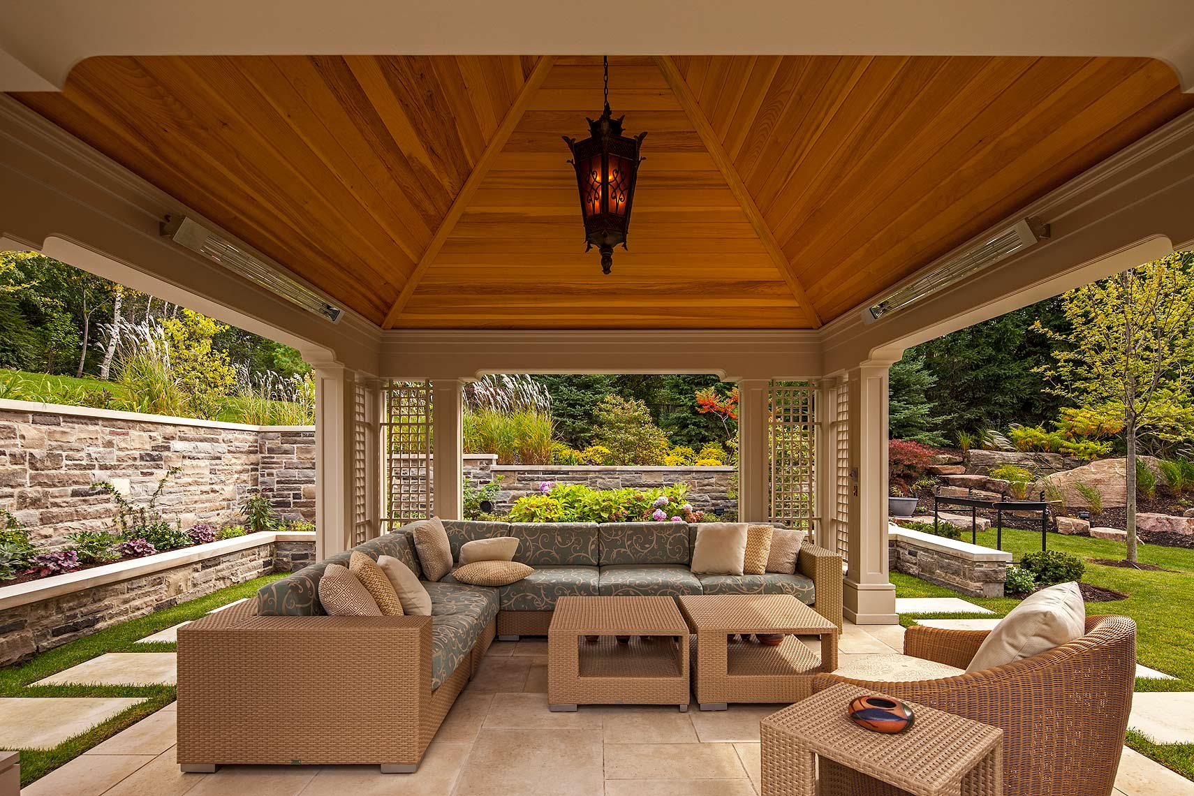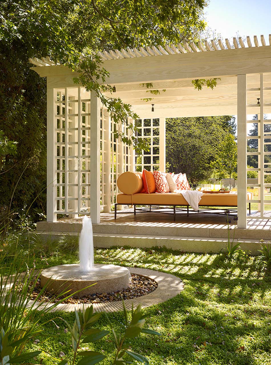 Clásico Este lujoso destino convierte la glorieta en un invernadero. En el edificio encuentran un lugar para árboles y flores en macetas. Los muebles se complementan con muebles antiguos. Las pérgolas están hechas de piedra o ladrillo y decoradas con forja.