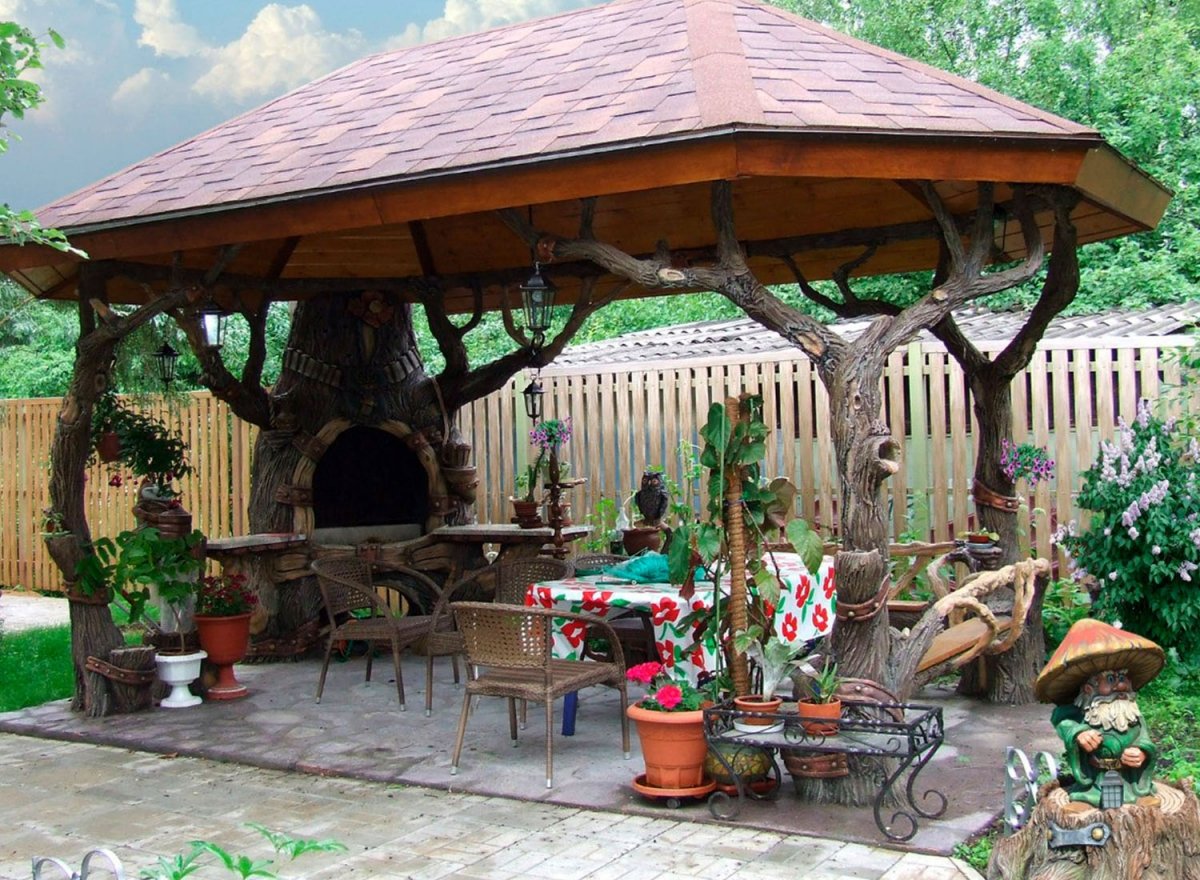 Estilo ecológico. Para la construcción del cenador, solo se eligen materiales naturales y respetuosos con el medio ambiente (madera). El techo a menudo está decorado con una alfombra de "musgo". En la decoración siempre hay ramas, tocones, barras de madera, cortes de sierra. La solución original será la construcción de una glorieta alrededor de un árbol vivo. El maletero se convertirá en parte de la composición interior.