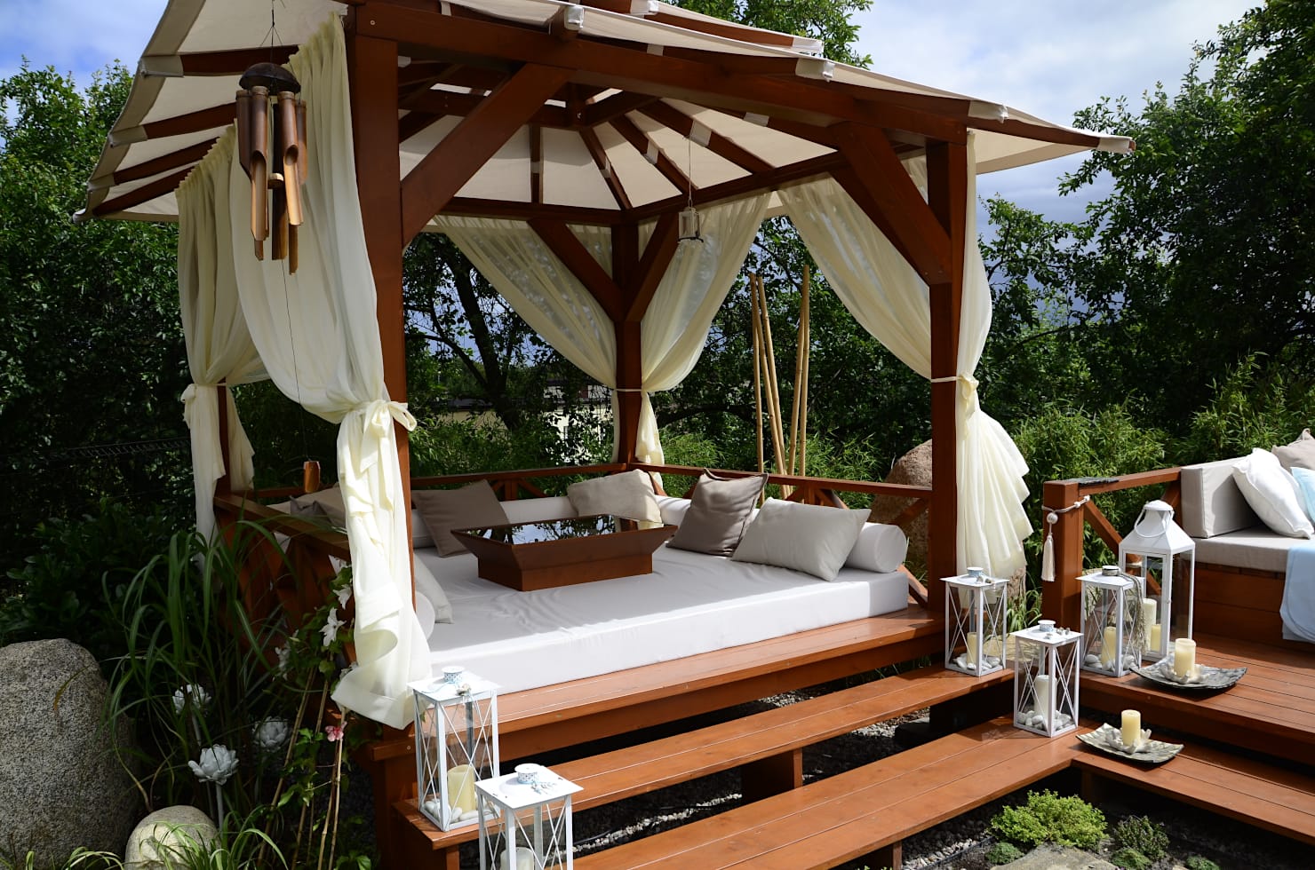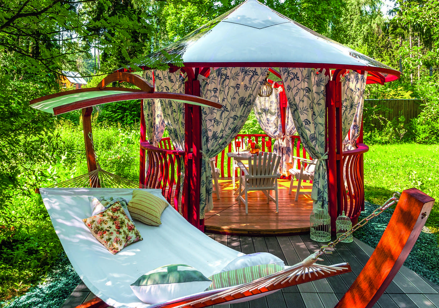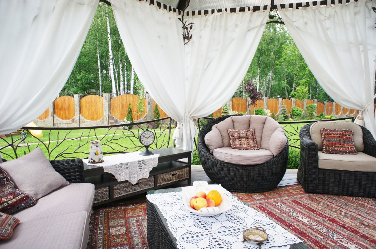 En el área de recreación, la presencia de muebles es obligatoria: sofás, sillas, tumbonas, otomanas o bancos. Al elegir, se guían por la cantidad de personas que estarán simultáneamente en la glorieta. Los anfitriones hospitalarios para grandes empresas adquieren amplios sofás y juegos de sillas ligeras de mimbre. La "cama" se puede construir independientemente de la construcción de paletas. Las paletas se conectan entre sí mediante tornillos autorroscantes, cubiertas con un paño, colchones y una armada de almohadas colocadas en la parte superior. Si la glorieta se usa solo en verano, es mejor comprar muebles de jardín plegables. Los edificios de tipo cerrado están equipados como salas de estar completas. La sala de estar será el mejor ejemplo.