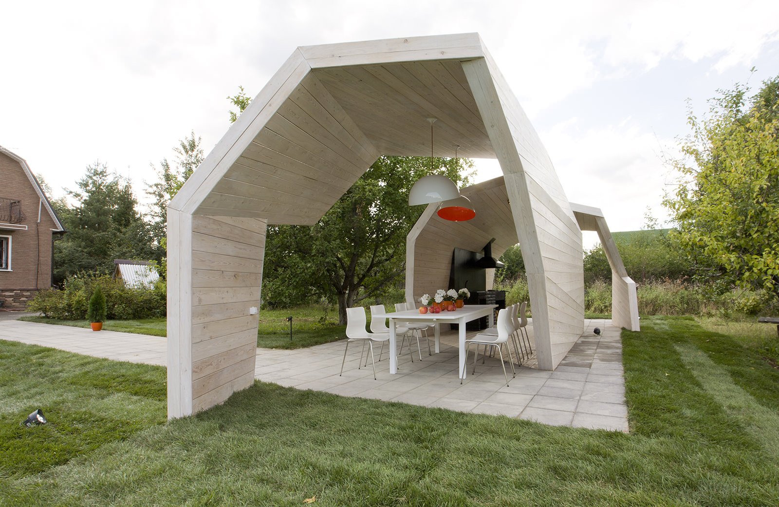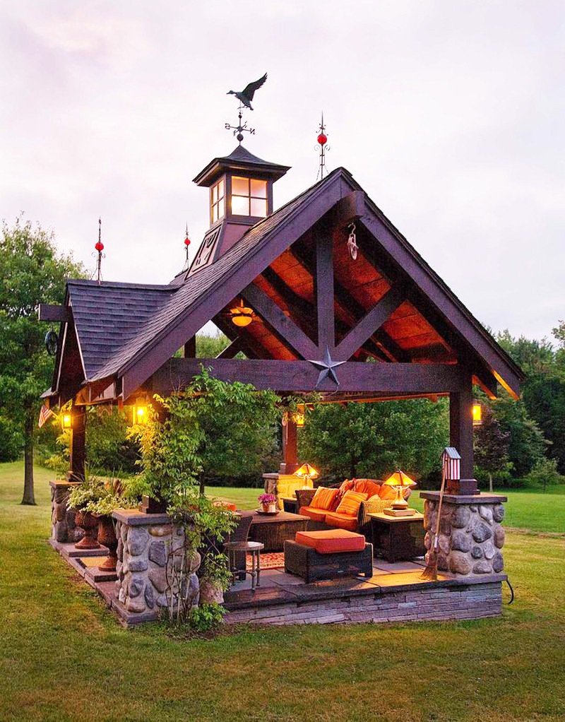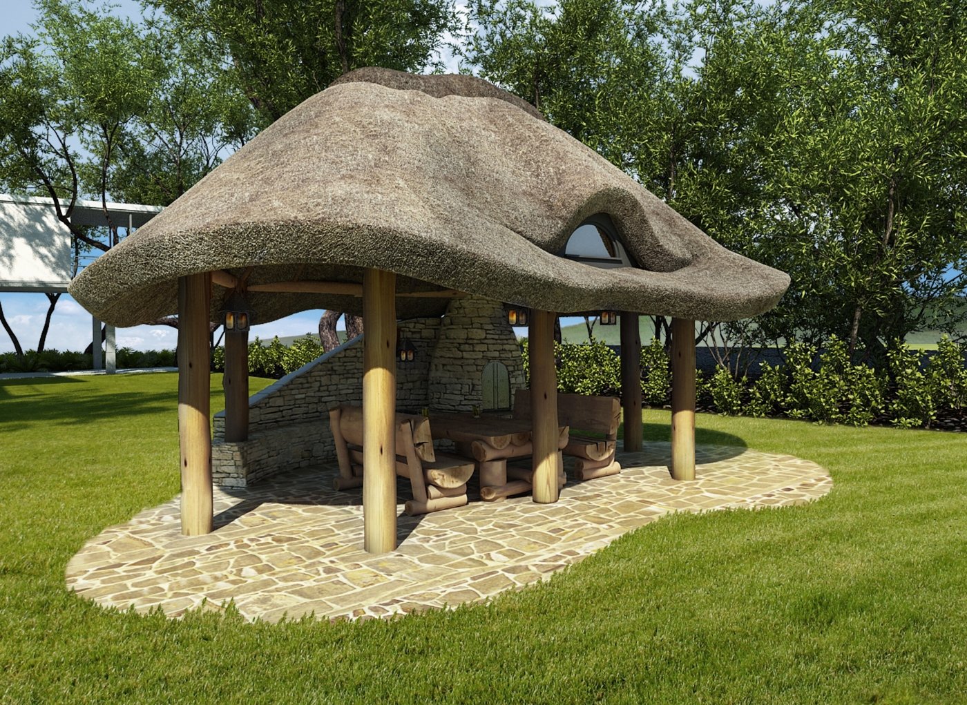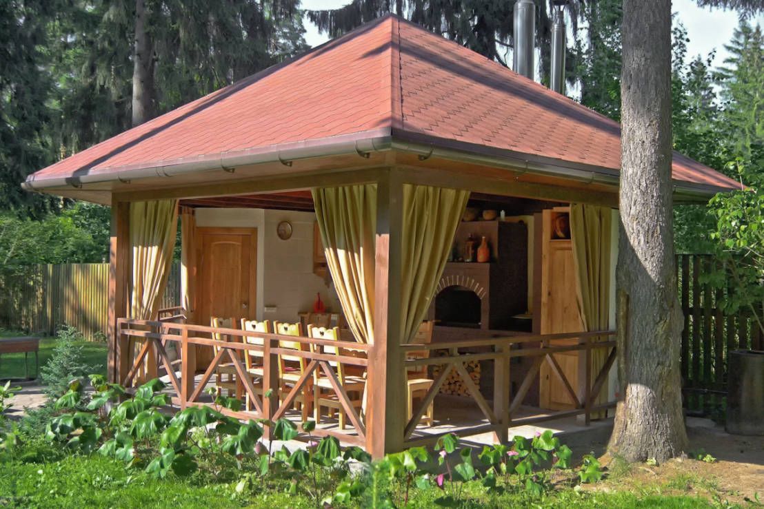 Hay otro tipo: pabellones de barbacoa. De hecho, la unidad para hornear carne y verduras puede decorar el interior de los cenadores abiertos y cerrados. No recomiendan instalar una barbacoa en edificios "vivos", ya que el humo y el calor pueden afectar negativamente a las plantas.
