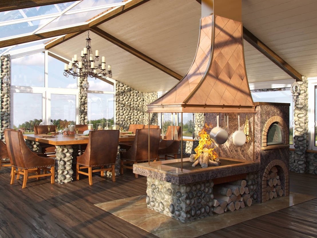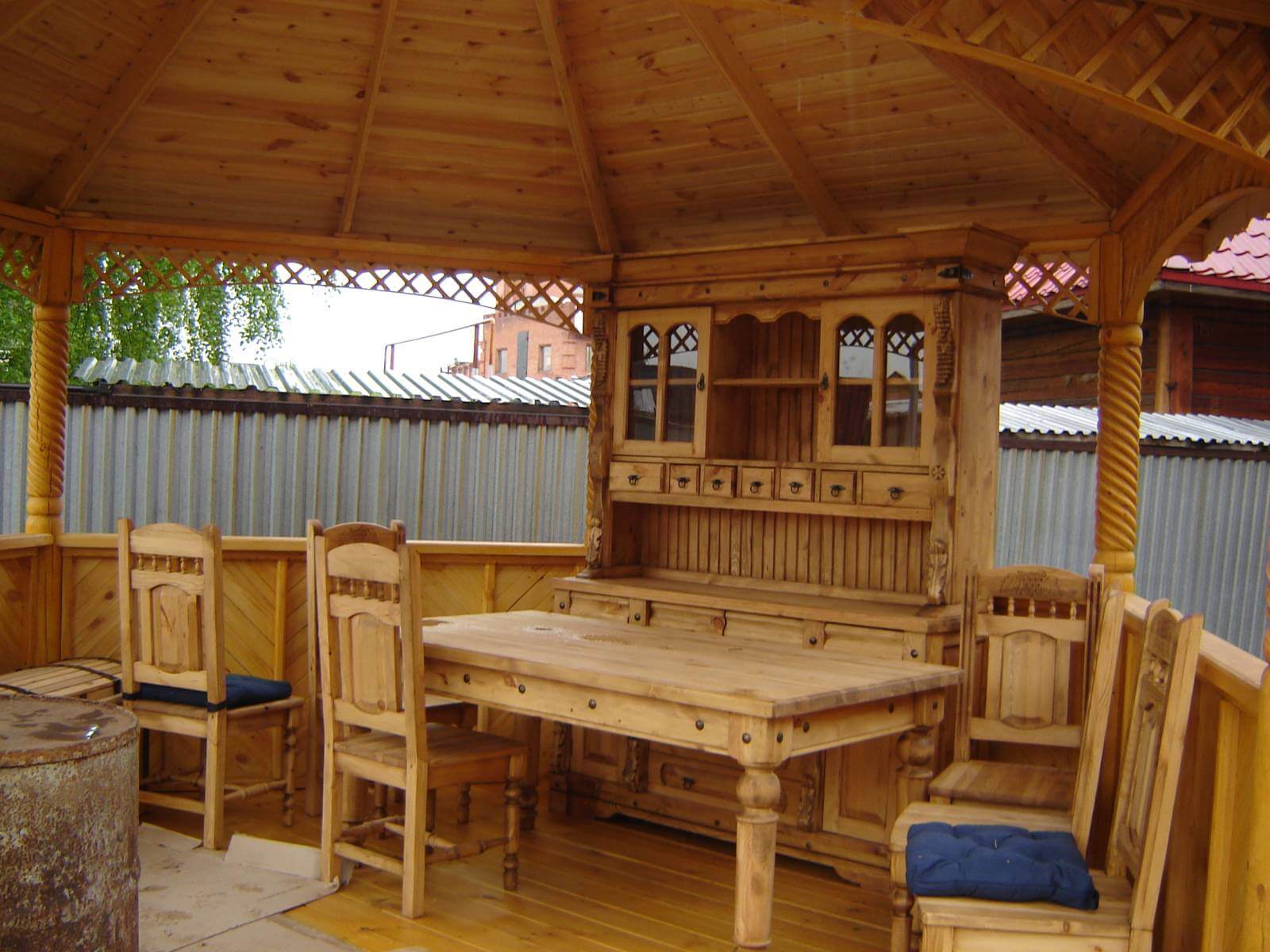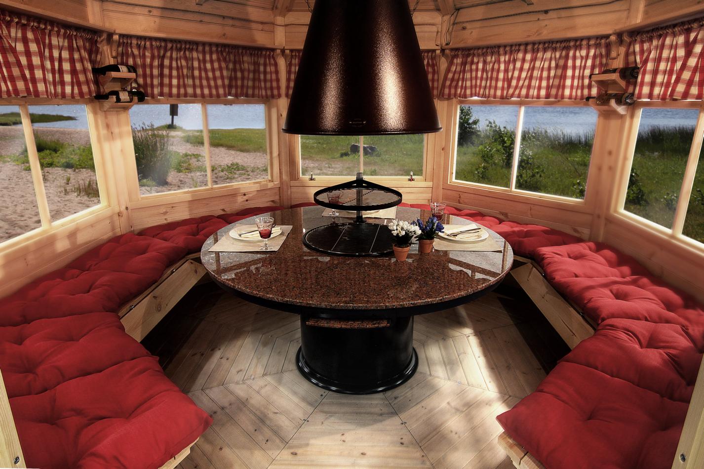 El comedor consta de una mesa y sillas o bancos. Por lo general, se coloca cerca de una ventana o contra paredes abiertas. Si se van a cocinar alimentos dentro del edificio, entonces el calor del hogar calentará mucho la habitación. Para estar en él era cómodo, es mejor poner la mesa más cerca del aire libre.Si no hay la cantidad requerida de sillas disponibles, y no es muy conveniente llevarlas constantemente desde la casa y de regreso cuando lleguen los invitados, entonces use bancos.