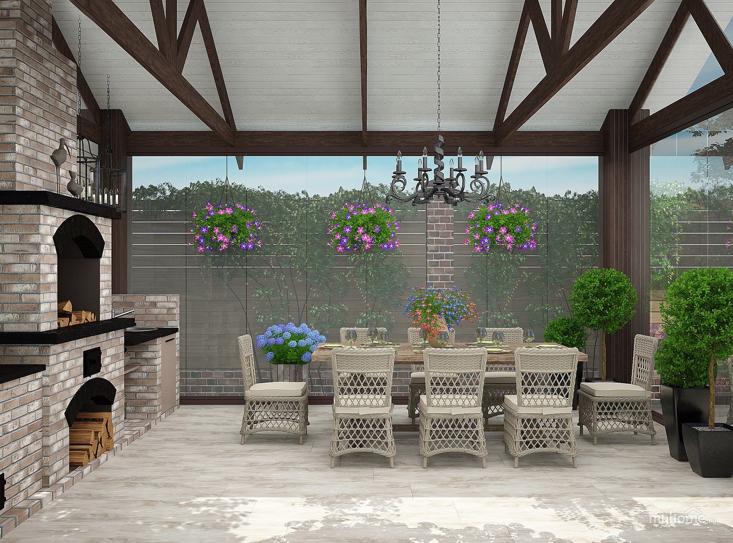 La cocina de verano reemplaza por completo lo habitual. No solo prepara el desayuno y la cena. Para liberar la cocina principal de la suciedad y el "sobrecalentamiento", se transfieren las conservas y la salazón de los regalos del jardín y del jardín. En la cocina de verano ponen un buffet, una mesa (área de trabajo), barbacoa (estufa, chimenea, hogar). Si existe esa oportunidad, se pasa agua al cenador y se instala un fregadero para platos y productos. La regla del triángulo de trabajo en la glorieta no se puede implementar (no ponen un refrigerador aquí). Sin embargo, los muebles deben estar dispuestos de modo que la anfitriona pueda moverse a lo largo de una ruta conveniente entre el hogar y el área de trabajo sin obstáculos.