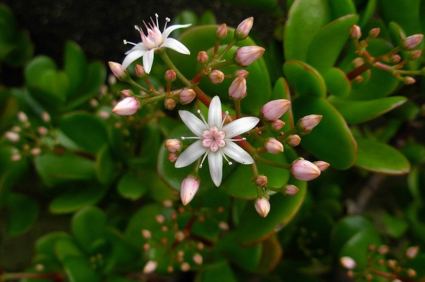 Ver un árbol de dinero cubierto de inflorescencias blancas es un gran éxito. Esta planta a menudo no está contenta con el color, porque crece lentamente y requiere condiciones especiales para la aparición de brotes. Si ocurre este evento, el dueño de la mujer gorda estará complacido con pequeñas flores blancas, similares a las estrellas, atadas en algunos o todos los brotes jóvenes.