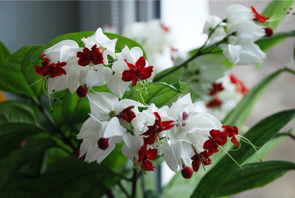 Una enredadera rizada en casa puede crecer 2.5 metros de largo. Hojas de color verde oscuro densamente esparcen el tallo. Clerdendrum Thomson se compara favorablemente con otros tipos de flores originales. Cinco sépalos blancos forman linternas pequeñas; una campana roja con pétalos doblados brota cerca.