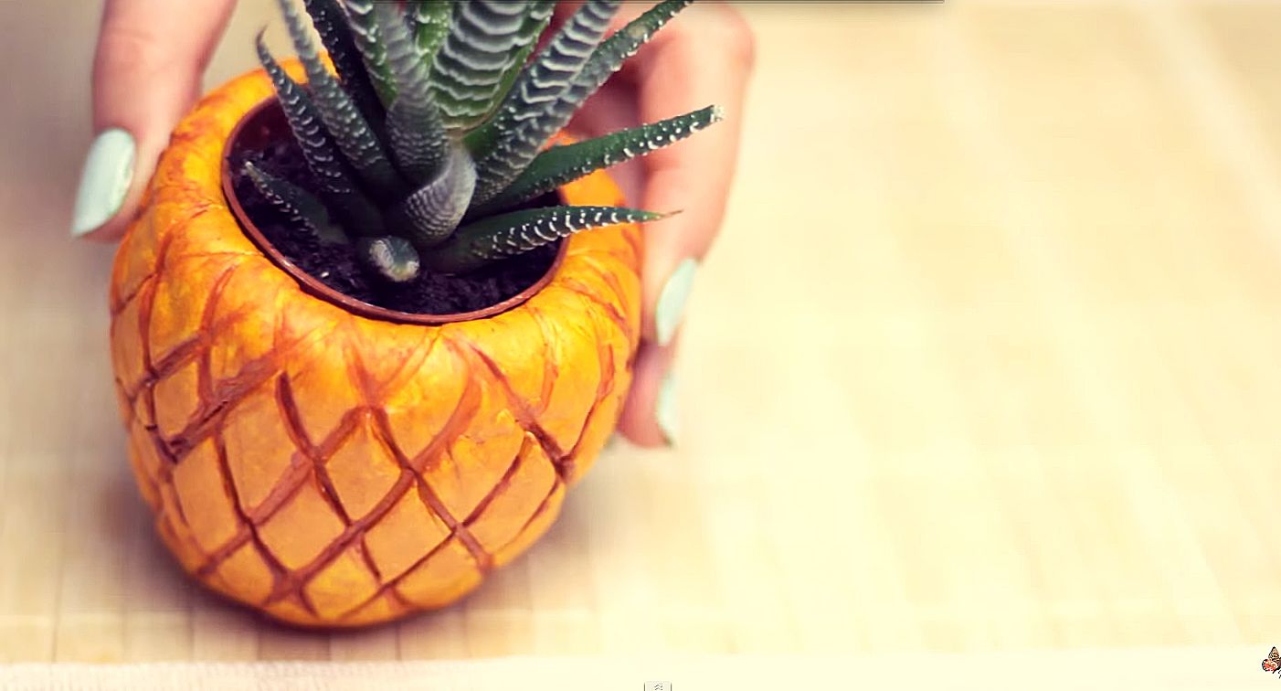 Una gran opción para las suculentas, que no exigen mucho riego. Por sobrehumectación, la carcasa explotará rápidamente y un contacto poco frecuente con el agua prolongará sus propiedades decorativas. Para hacer una mini maceta exótica, necesita un coco, una pieza adornada de un palo para decorar la composición.