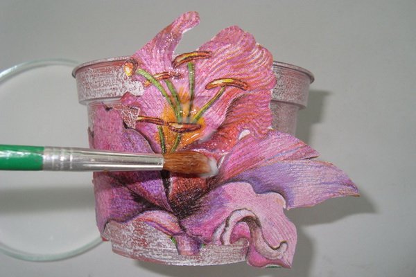 Moje un trozo de papel con agua y extiéndalo suavemente con un cepillo sobre la superficie. Aplicamos la película a la olla con un trozo de papel y presionamos hacia abajo. Retire con cuidado el archivo, el motivo recortado permanecerá en el costado del contenedor. Arreglamos todo con pegamento y barniz PVA.