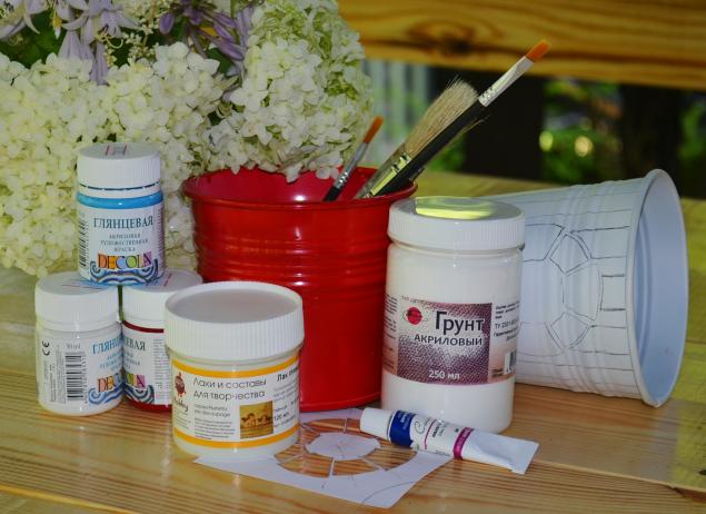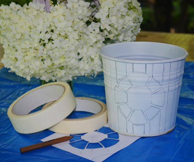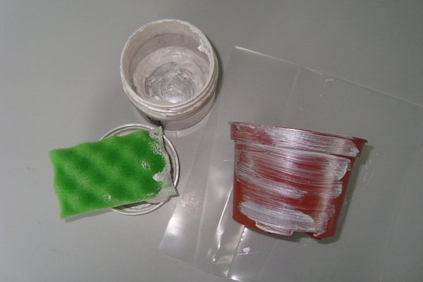 Transferir la imagen a la olla es muy simple. El recipiente debe lavarse, limpiarse con papel de lija fino y desengrasarse, pintarse con tierra. Luego aplique el color de fondo principal. Recortamos la imagen que nos gusta y la colocamos en una película o archivo adhesivo.
