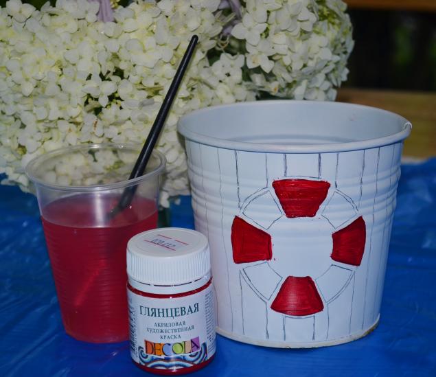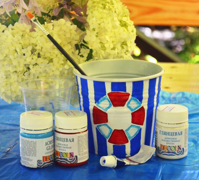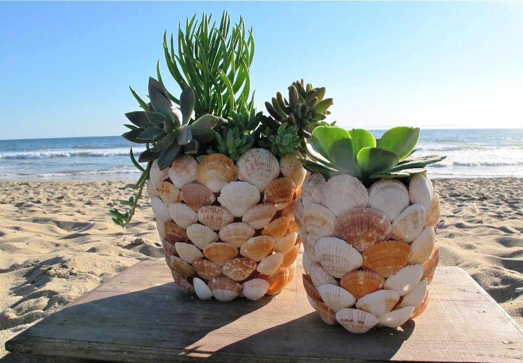 Fije los elementos decorativos al pegamento de secado rápido. Se aplica a la superficie de las macetas y a la base de las piezas. Cada caparazón debe apoyarse y mantenerse durante varios segundos. Cuando se pega toda la olla, es necesario procesar los huecos con lechada para las costuras. Los elementos marinos pueden dejarse en su color natural o recubrirse con acrílico multicolor.