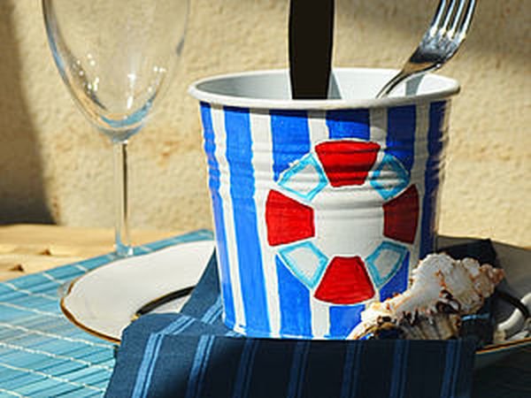 Elija una lata alta y borre la etiqueta. Si la superficie es desigual, se debe poner masilla. Aplicamos la solución para el mosaico y sujetamos piezas pequeñas a la solución de acuerdo con los espacios. Cubrimos la olla con una mezcla especial para la lechada. Limpie bien con un paño seco y deje secar.