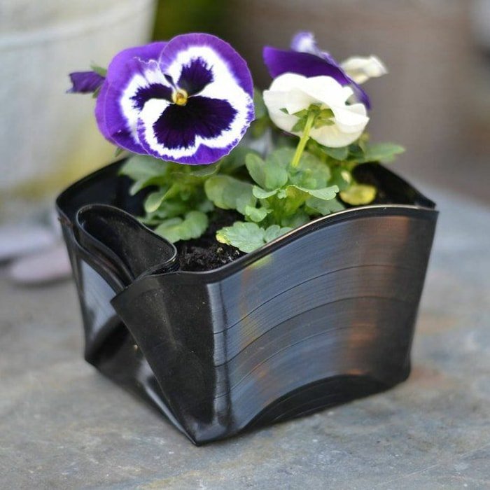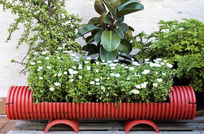 La forma más fácil de hacer una maceta improvisada es utilizar tubos de plástico de gran diámetro para plantar plantas. Es suficiente simplemente cortar un trozo de altura adecuada para el florero, instalarlo en la calle, llenar el suelo y plantar flores. Después de haber hecho varias de estas macetas, puede diseñar toda la composición en el sitio.