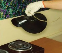 Limpiamos la placa de la etiqueta. Pasamos la cuerda por el agujero, fijamos su extremo con una tuerca y una cubierta de hierro. Sosteniendo el vinilo en un extremo de la cuerda, encienda lentamente el quemador. Tan pronto como los bordes se hunden bajo la influencia de la alta temperatura, sacamos rápidamente la cuerda y la abrazadera, colocamos la placa en la forma (recipiente invertido) y presionamos los bordes negros. Hasta que el material se haya congelado, se le puede dar cualquier forma.