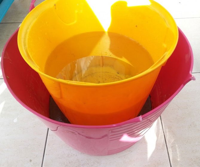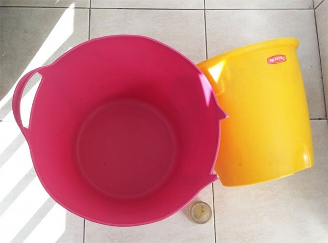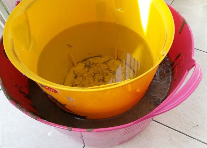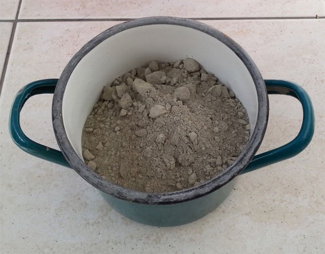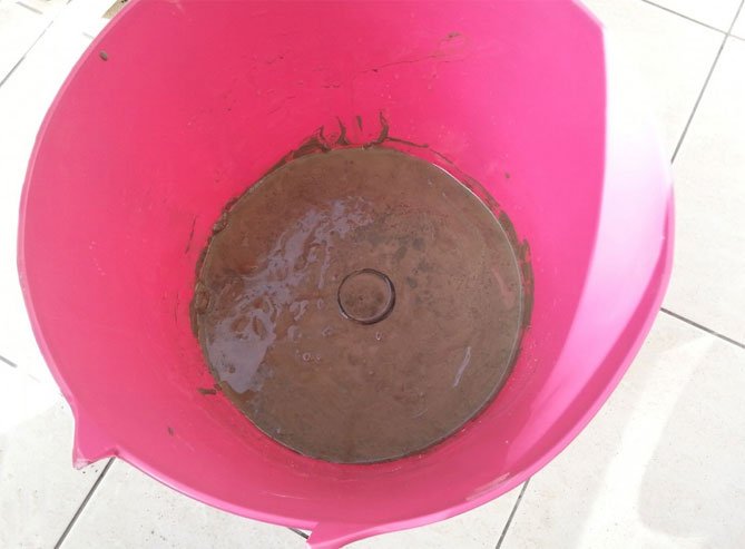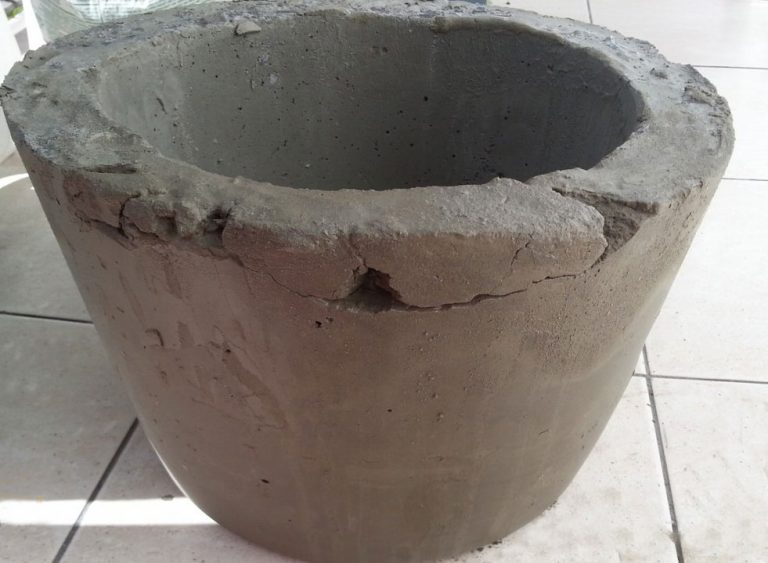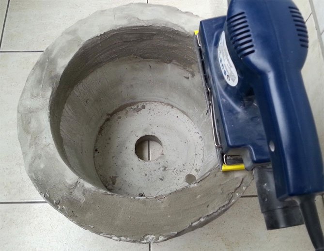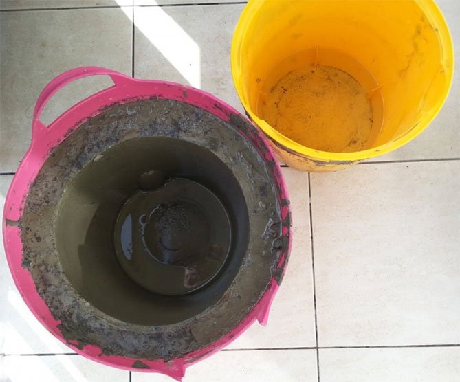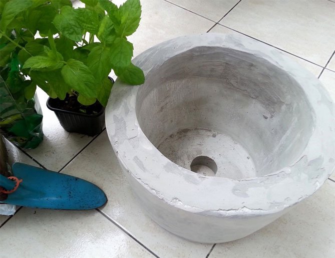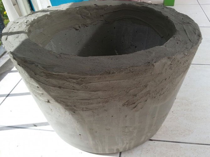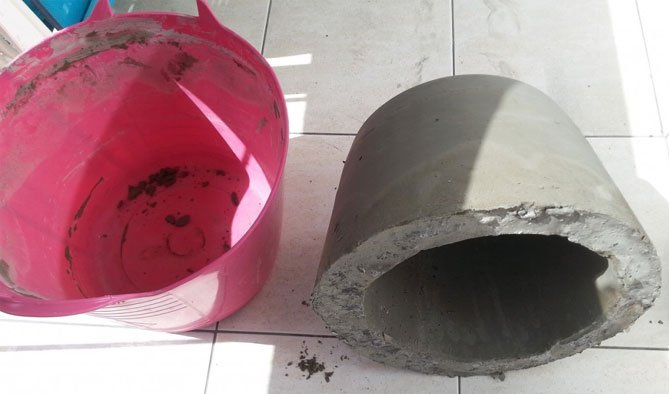 Para hacer una olla de cemento, necesitará un cubo de plástico de la mezcla de construcción. Limpiamos el contenedor temporal de las etiquetas, retiramos el asa, lo lubricamos desde adentro con aceite. Amasar la solución de acuerdo con todas las reglas y verterla en el balde preparado. El cemento no debe alcanzar los bordes. En un recipiente de 5 litros, debe amasar una solución de 4 litros.